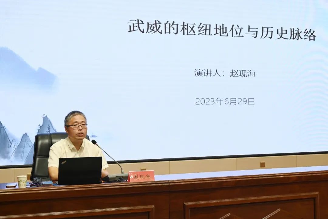 6月29日,2023年第二期《涼州講壇》在武威市開講,中國社會科學院古代史研究所古代通史研究室主任、研究員趙現(xiàn)海應邀在武威職業(yè)學院作《武威的樞紐地位與歷史脈絡》的專題講座。市委宣傳部常務副部長林艷軍主持。
