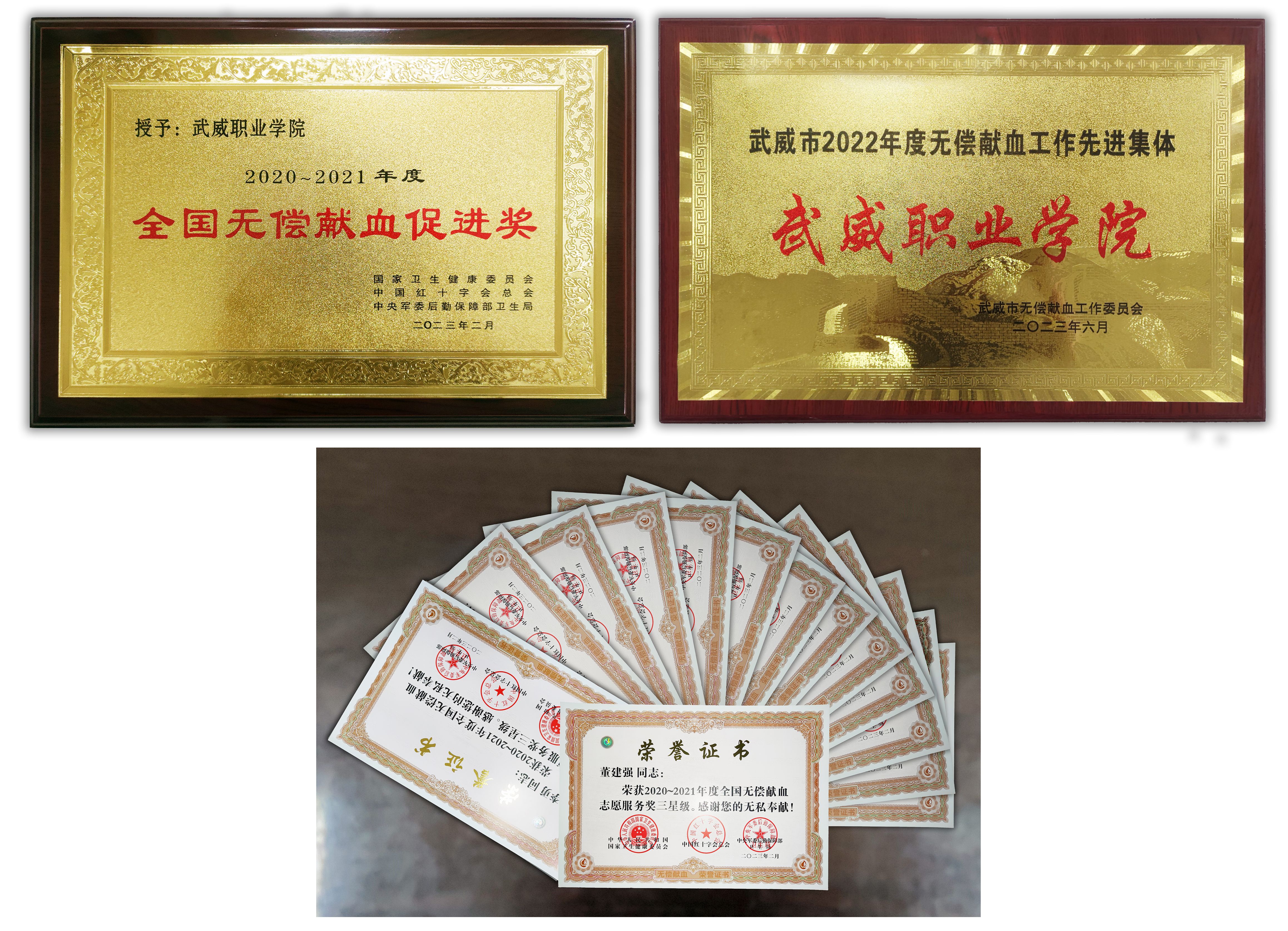 學(xué)校繼2020年獲得“2018-2019年度全國(guó)無(wú)償獻(xiàn)血促進(jìn)獎(jiǎng)”后,再次榮獲“2020-2021年度全國(guó)無(wú)償獻(xiàn)血促進(jìn)獎(jiǎng)”,14名師生榮獲全國(guó)無(wú)償獻(xiàn)血志愿服務(wù)獎(jiǎng)。我校護(hù)理學(xué)院被評(píng)為武威市2022年度無(wú)償獻(xiàn)血工作先進(jìn)集體,1名教師被評(píng)為先進(jìn)個(gè)人。