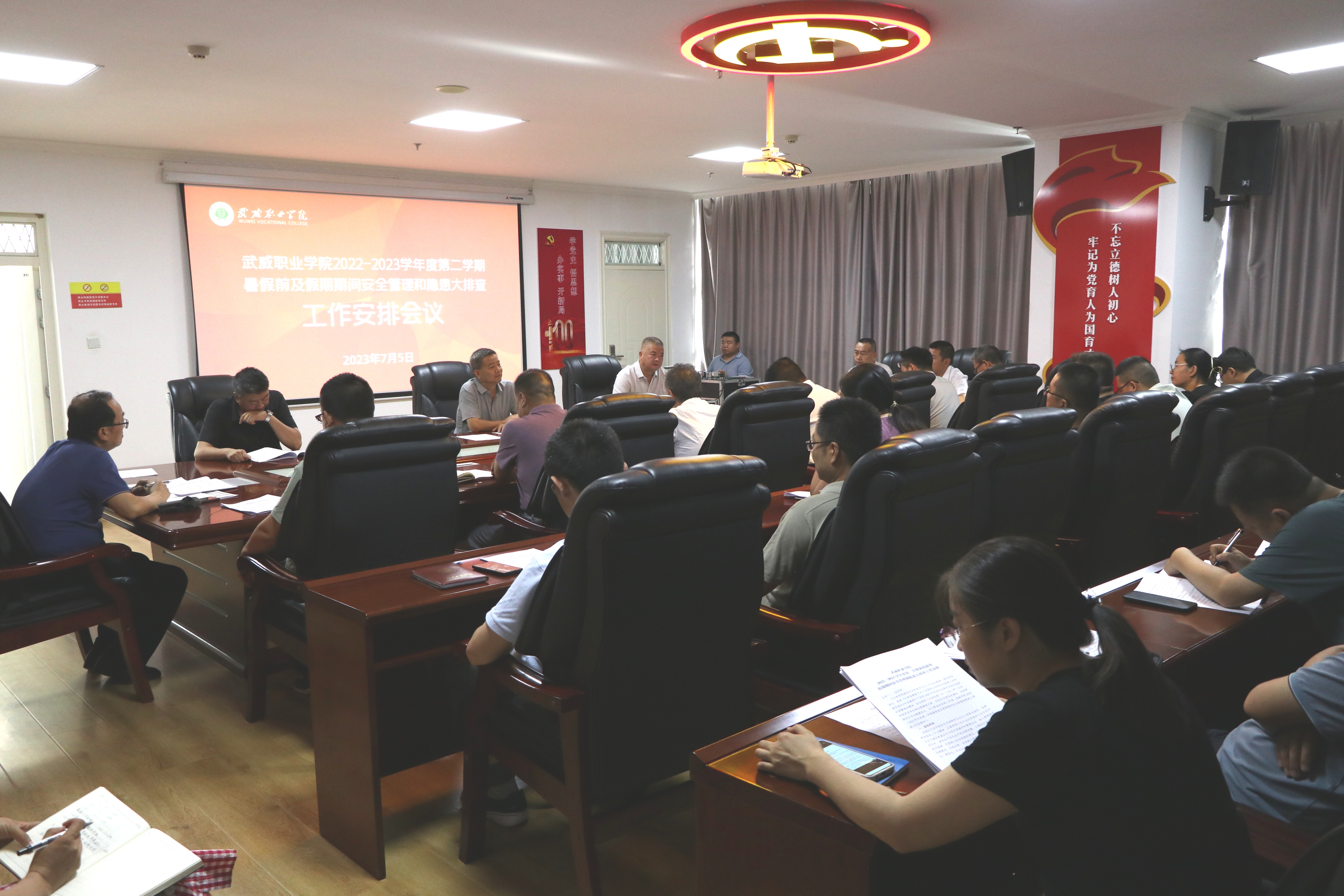 王守云傳達(dá)了《甘肅省教育廳關(guān)于加強(qiáng)職業(yè)學(xué)校安全管理工作的緊急通知》精神。分析研判了學(xué)校當(dāng)前學(xué)生安全教育管理面臨的形勢(shì),并安排部署了武威職業(yè)學(xué)院2022至2023學(xué)年第二學(xué)期暑假前及暑假期間安全管理及安全隱患大排查工作。