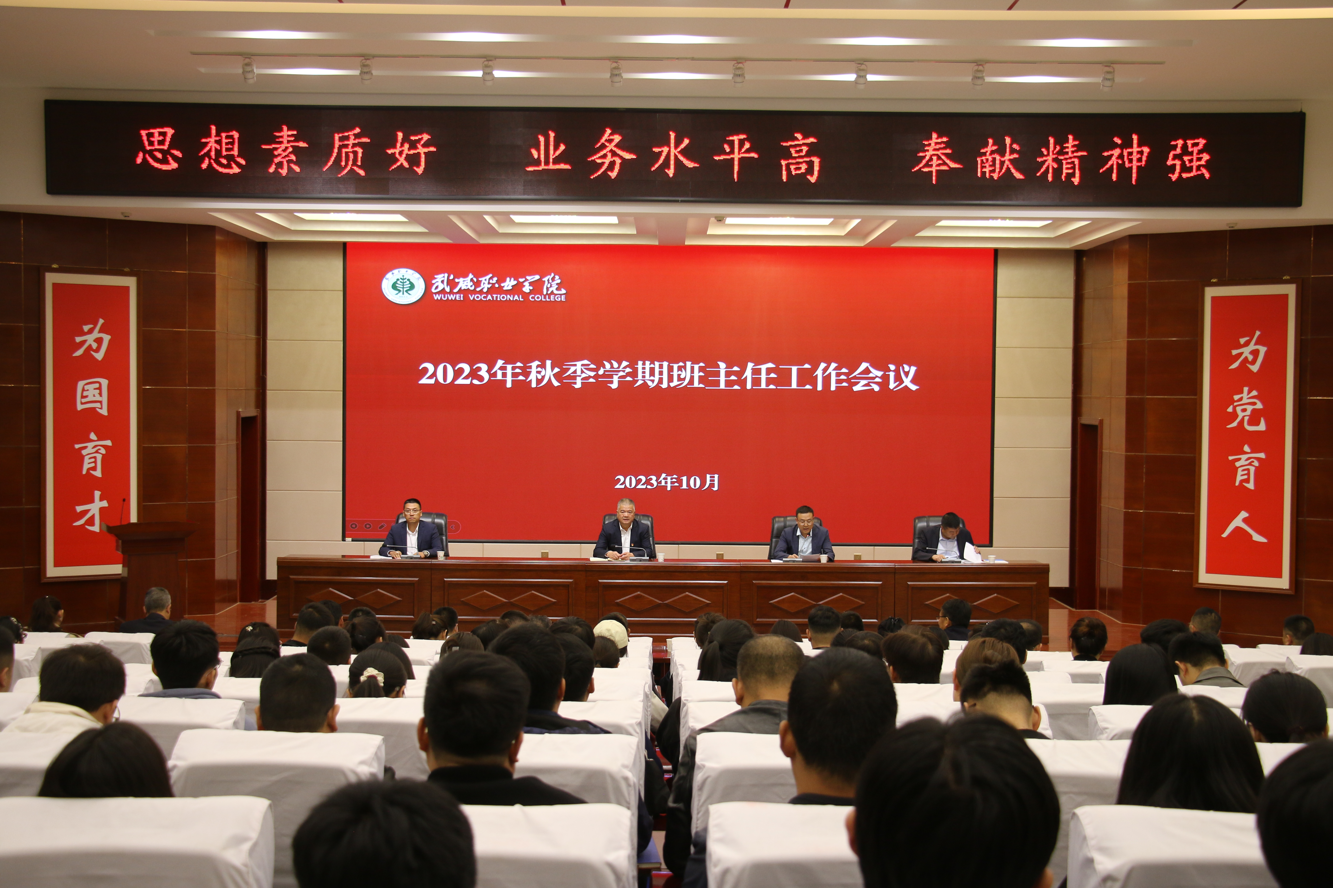 會(huì)議上,高鵬堂領(lǐng)學(xué)了《武威職業(yè)學(xué)院班主任工作實(shí)施辦法》《武威職業(yè)學(xué)院班主任工作考核辦法》等制度文件,結(jié)合具體工作提出要求;招生就業(yè)處負(fù)責(zé)人董鵬、安全保衛(wèi)處負(fù)責(zé)人李欣就班主任相關(guān)工作進(jìn)行了說(shuō)明和要求;中科低碳新能源技術(shù)學(xué)院負(fù)責(zé)人胡建宏針對(duì)班導(dǎo)師工作進(jìn)行了交流發(fā)言,護(hù)理學(xué)院黨總支書(shū)記張建輝針對(duì)班主任管理工作進(jìn)行了交流發(fā)言,武威市優(yōu)秀班主任獲得者、經(jīng)濟(jì)管理學(xué)院教師姚盈就班主任工作經(jīng)驗(yàn)和心得進(jìn)行了交流發(fā)言。