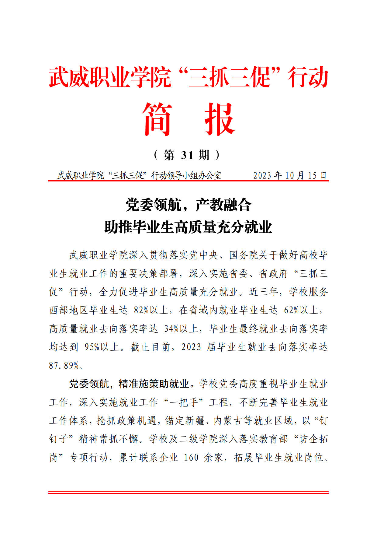 簡報第31期:黨委領(lǐng)航、產(chǎn)教融合,助推畢業(yè)生高質(zhì)量充分就業(yè)