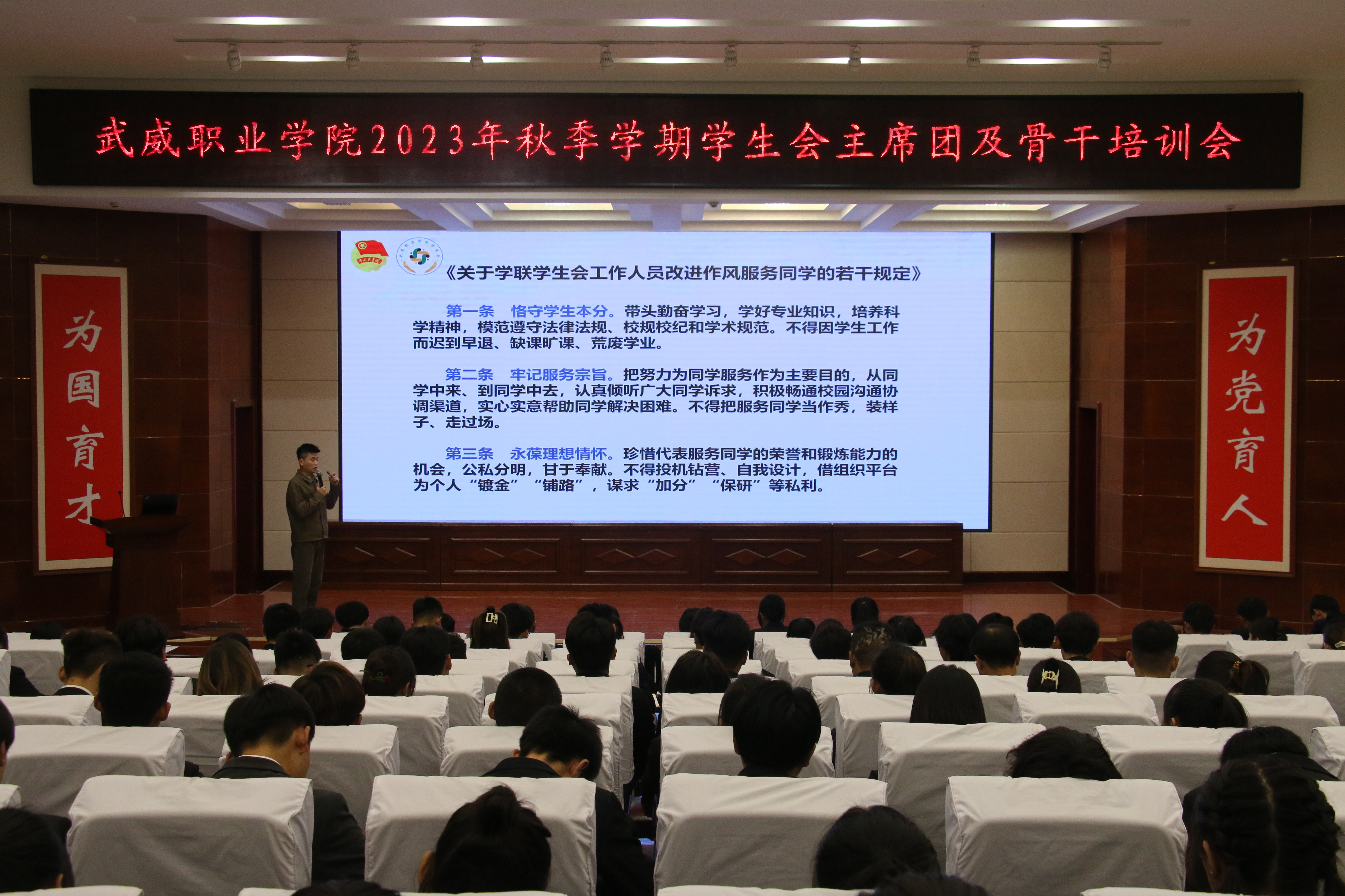 校學生會主席團成員帶頭領(lǐng)學了《關(guān)于學聯(lián)學生會工作人員改進作風服務(wù)同學的若干規(guī)定》《武威職業(yè)學院學生會章程》等制度文件。學生會秘書長張登海以《微光凝聚星海,筑夢情懷方舟》為題,圍繞加強思想政治建設(shè)、深化學生會組織改革和進一步加強從嚴治會等方面,為學生會組織成員展開培訓。