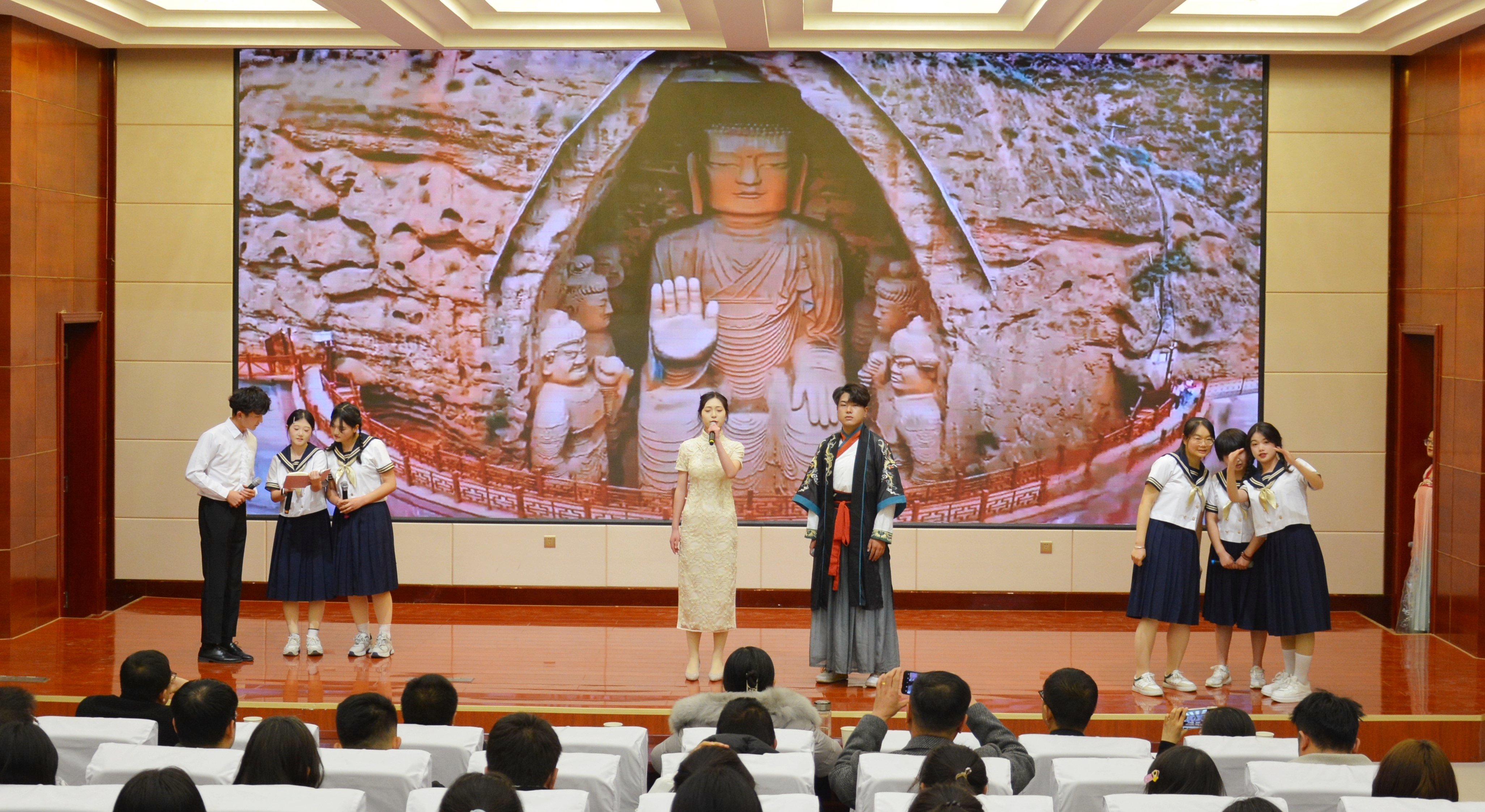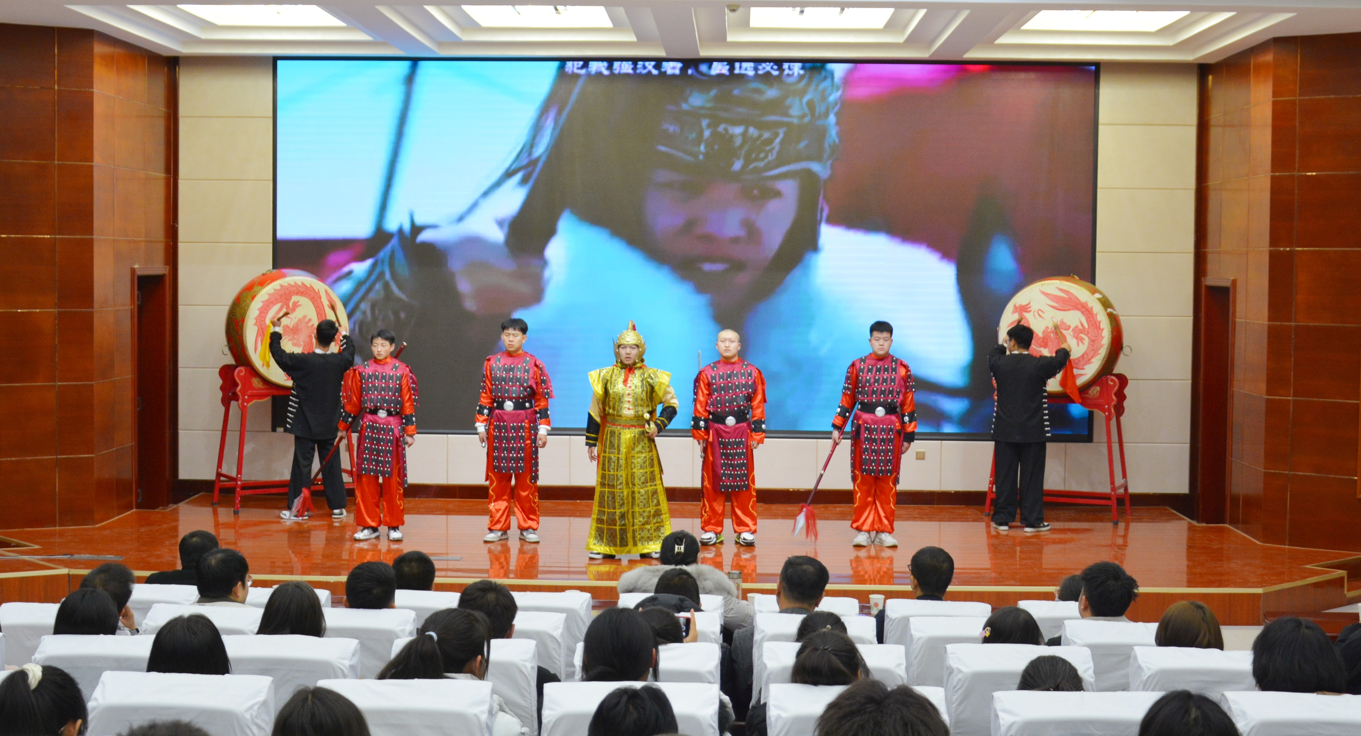 比賽現(xiàn)場(chǎng)精彩紛呈,現(xiàn)場(chǎng)氣氛異常熱烈,掌聲此起彼伏。節(jié)目以詩歌吟誦、伴舞、書法、國畫、武術(shù)、情景表演等豐富多彩的藝術(shù)形式,為現(xiàn)場(chǎng)觀眾打造出一場(chǎng)別開生面的涼州文化視聽盛宴。同學(xué)們激情洋溢,用澎湃真摯的情感演繹著經(jīng)典燦爛的磅礴詩篇,用跨越千年的對(duì)話勾勒出雄渾壯烈的漢武雄風(fēng),用鏗鏘有力的旋律編織出蕩氣回腸的時(shí)代頌歌,以青春奮斗的初心賡續(xù)著生生不息的五涼文化。