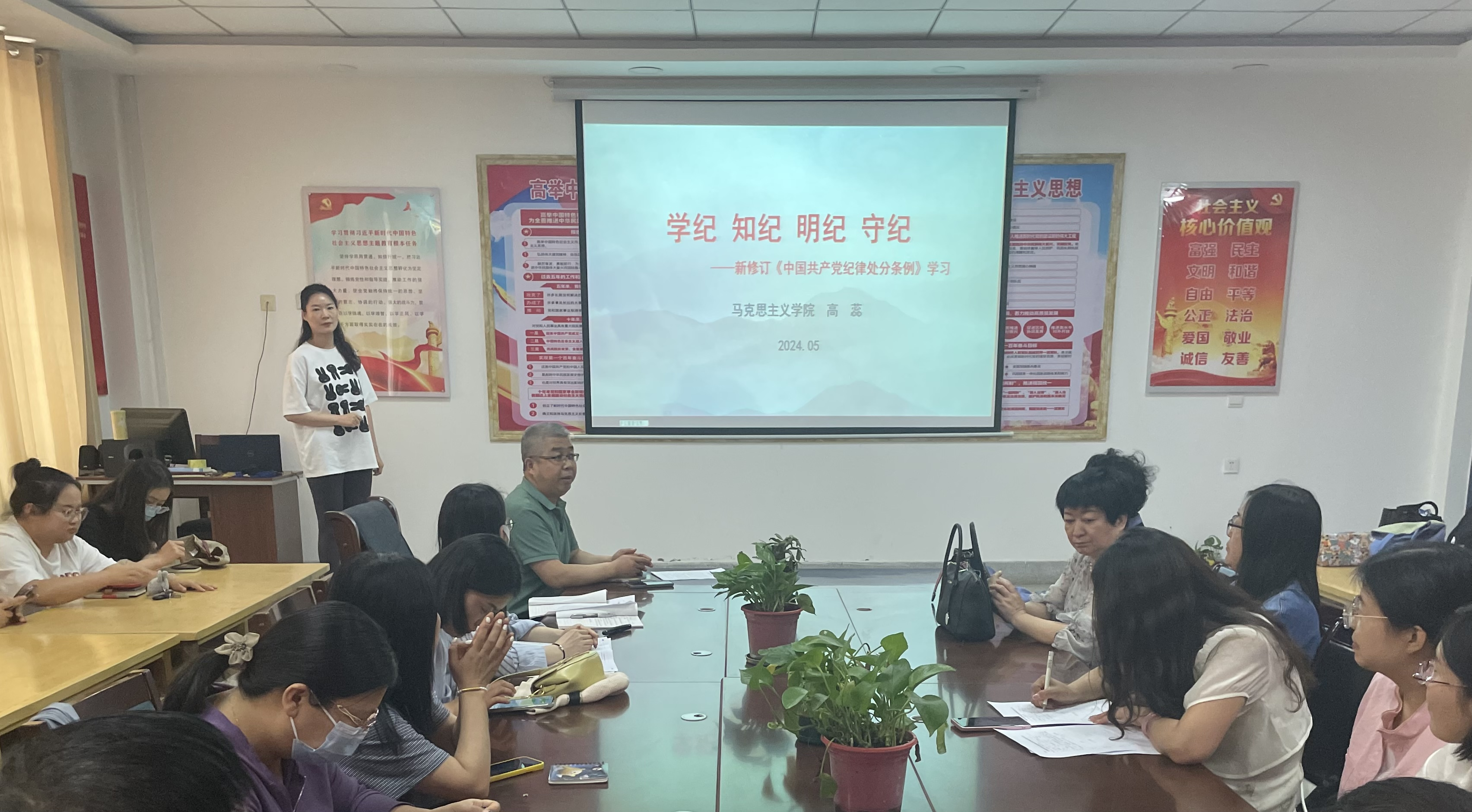 為扎實推動護理學院黨紀學習教育走深走實,進一步嚴明政治紀律和政治規(guī)矩,5月17日,學院邀請學校宣講組成員、馬克思主義學院副教授高蕊對《中國共產黨紀律處分條例》(以下簡稱《條例》)進行專題宣講解讀,學院黨總支書記張建輝主持宣講活動,全體黨員干部參加。