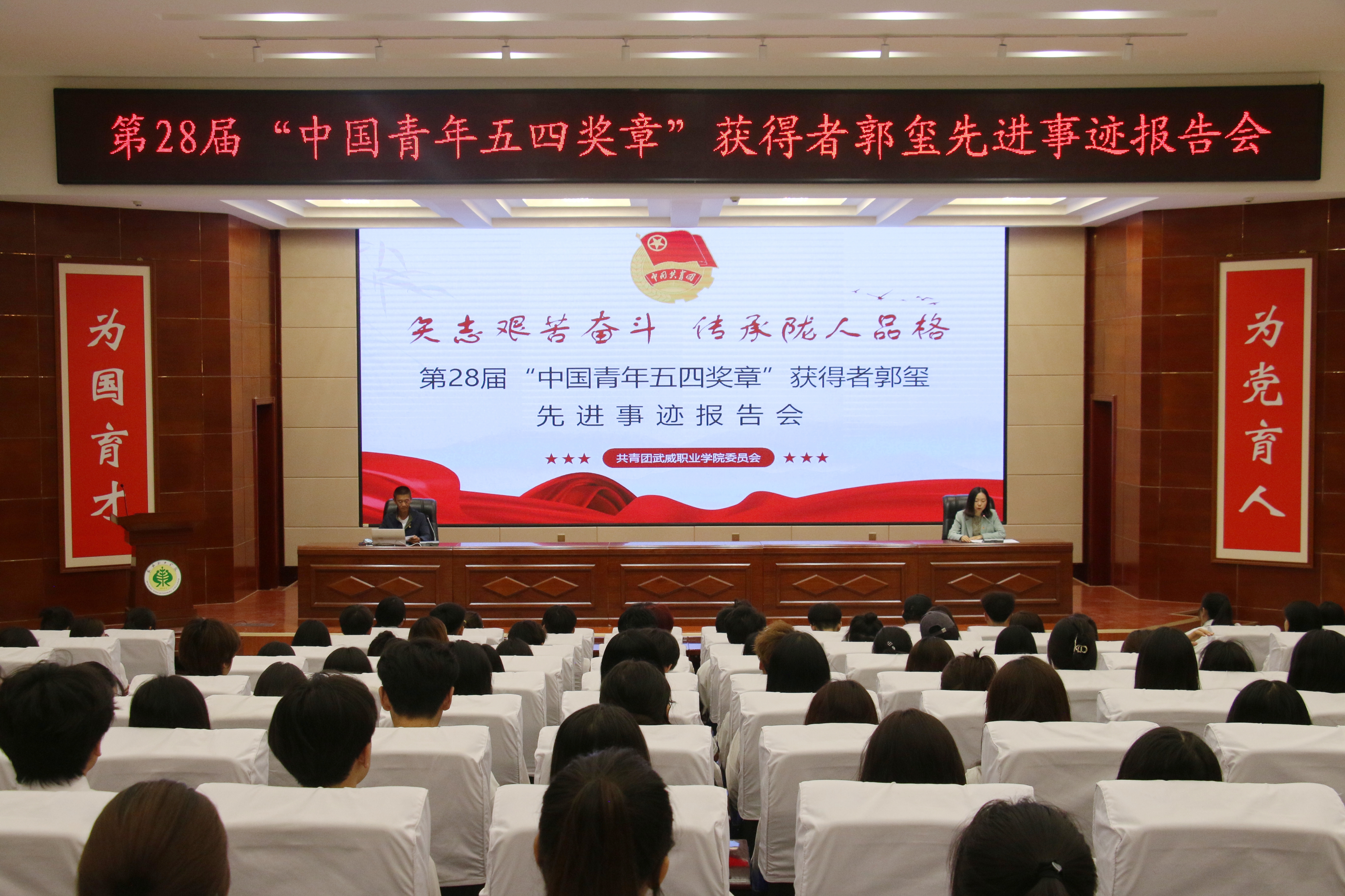 為進(jìn)一步引導(dǎo)和激勵(lì)團(tuán)員青年踔厲奮發(fā)、篤行不怠,厚植奮斗底色,5月24日,學(xué)校在菁英廳舉行“矢志艱苦奮斗傳承隴人品格”第28屆“中國青年五四獎(jiǎng)?wù)隆眰€(gè)人先進(jìn)事跡報(bào)告會(huì)。學(xué)校邀請(qǐng)第28屆“中國青年五四獎(jiǎng)?wù)隆鲍@得者——郭璽同志出席活動(dòng),并作了“三代青春鑄綠洲”主題宣講報(bào)告。學(xué)?!扒囫R工程”培訓(xùn)班學(xué)員、優(yōu)秀學(xué)生代表共計(jì)220余人參加報(bào)告會(huì)。會(huì)議由團(tuán)委副書記謝麗霞主持。