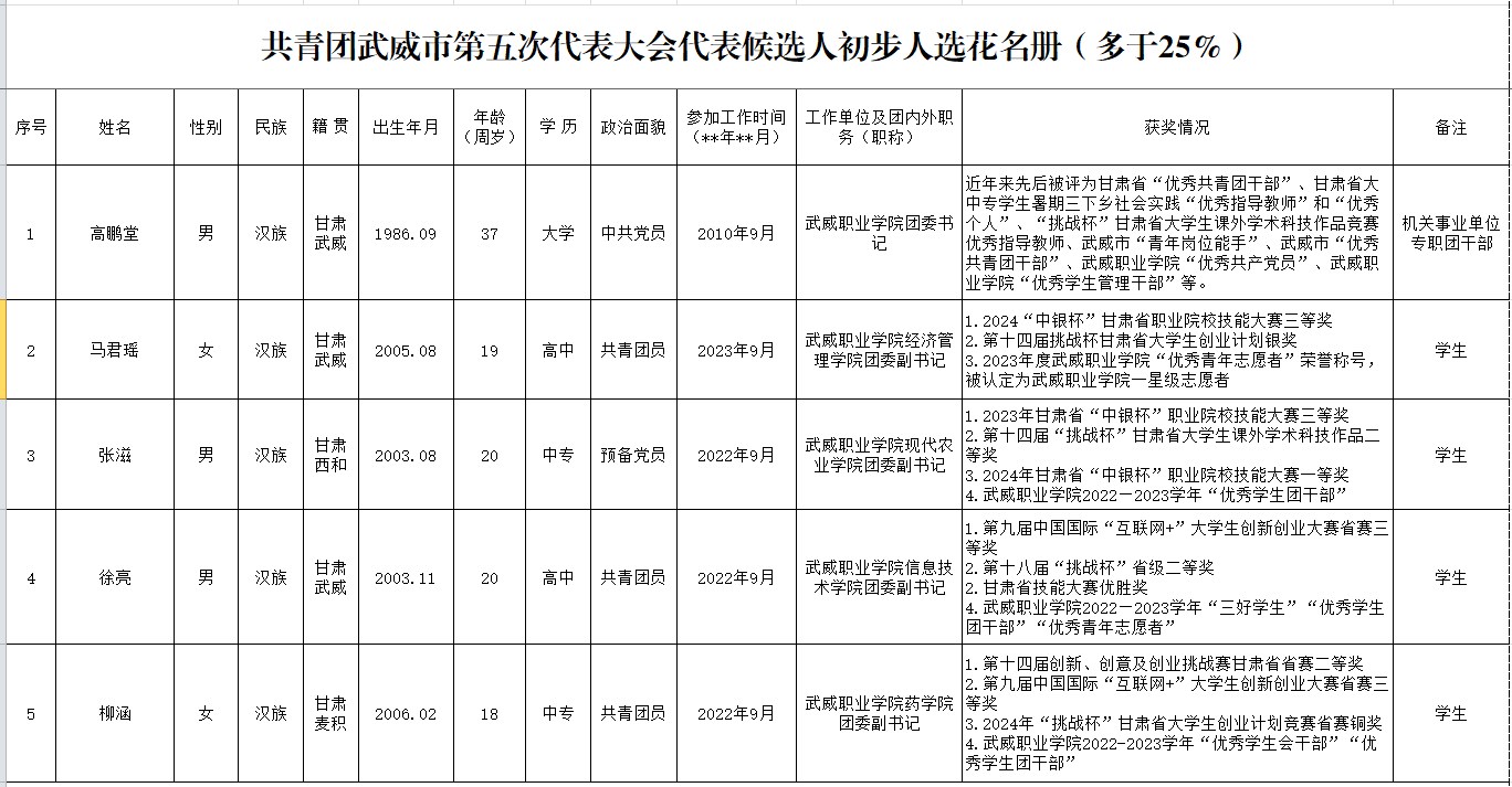 綜合考察結(jié)果及初步人選25%差額比例要求,經(jīng)武威職業(yè)學(xué)院團(tuán)委研究,并報(bào)請學(xué)校黨委同意,擬定高鵬堂等5名同志為共青團(tuán)武威市第五次代表大會代表候選人初步人選,現(xiàn)予以公示。