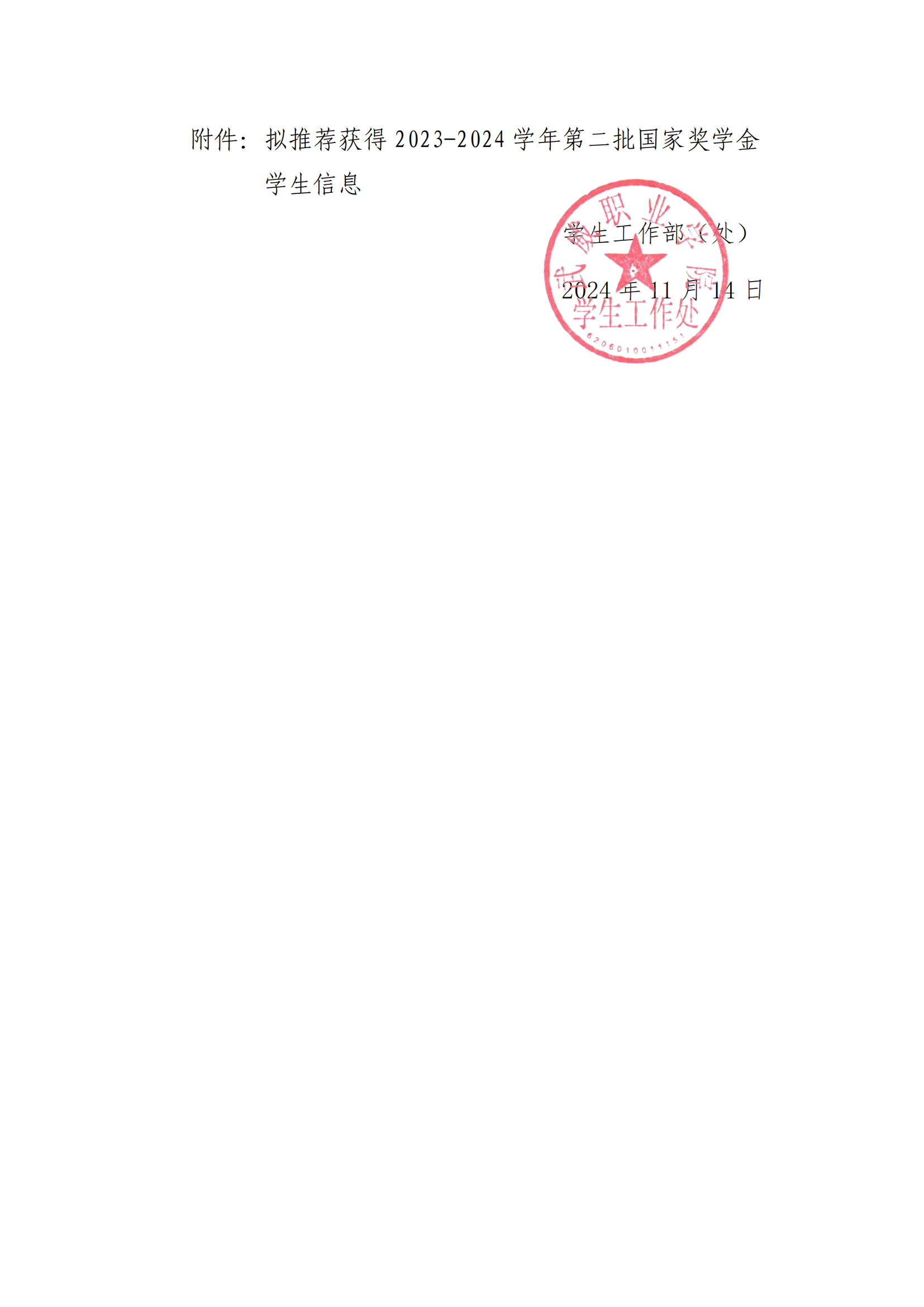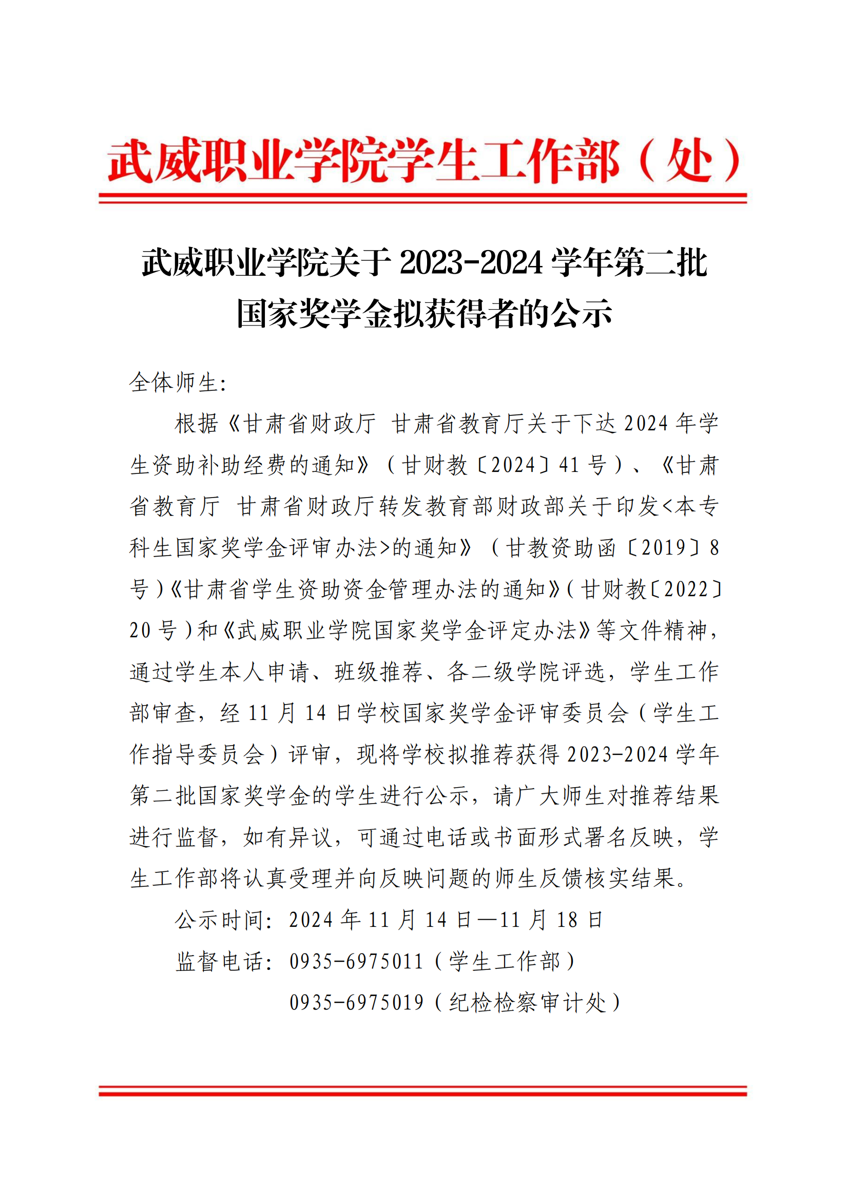 武威職業(yè)學院關于2023-2024學年第二批國家獎學金擬獲得者的公示