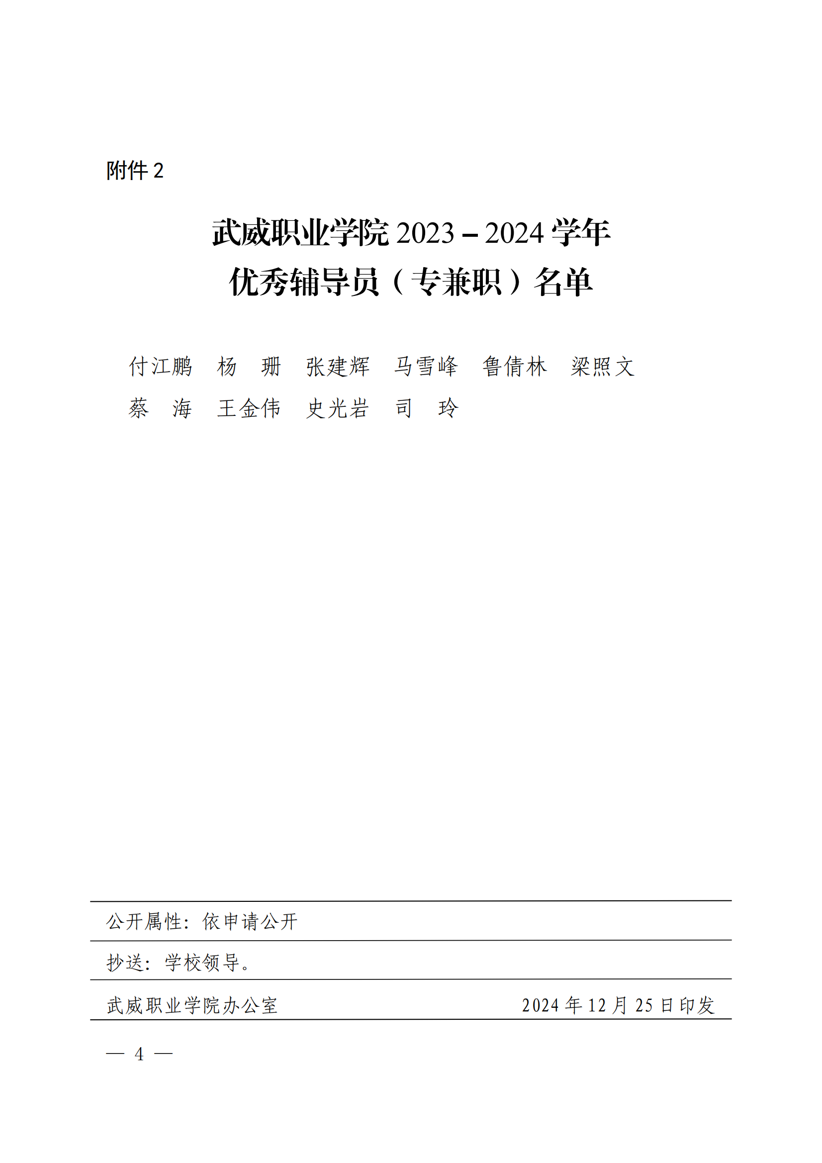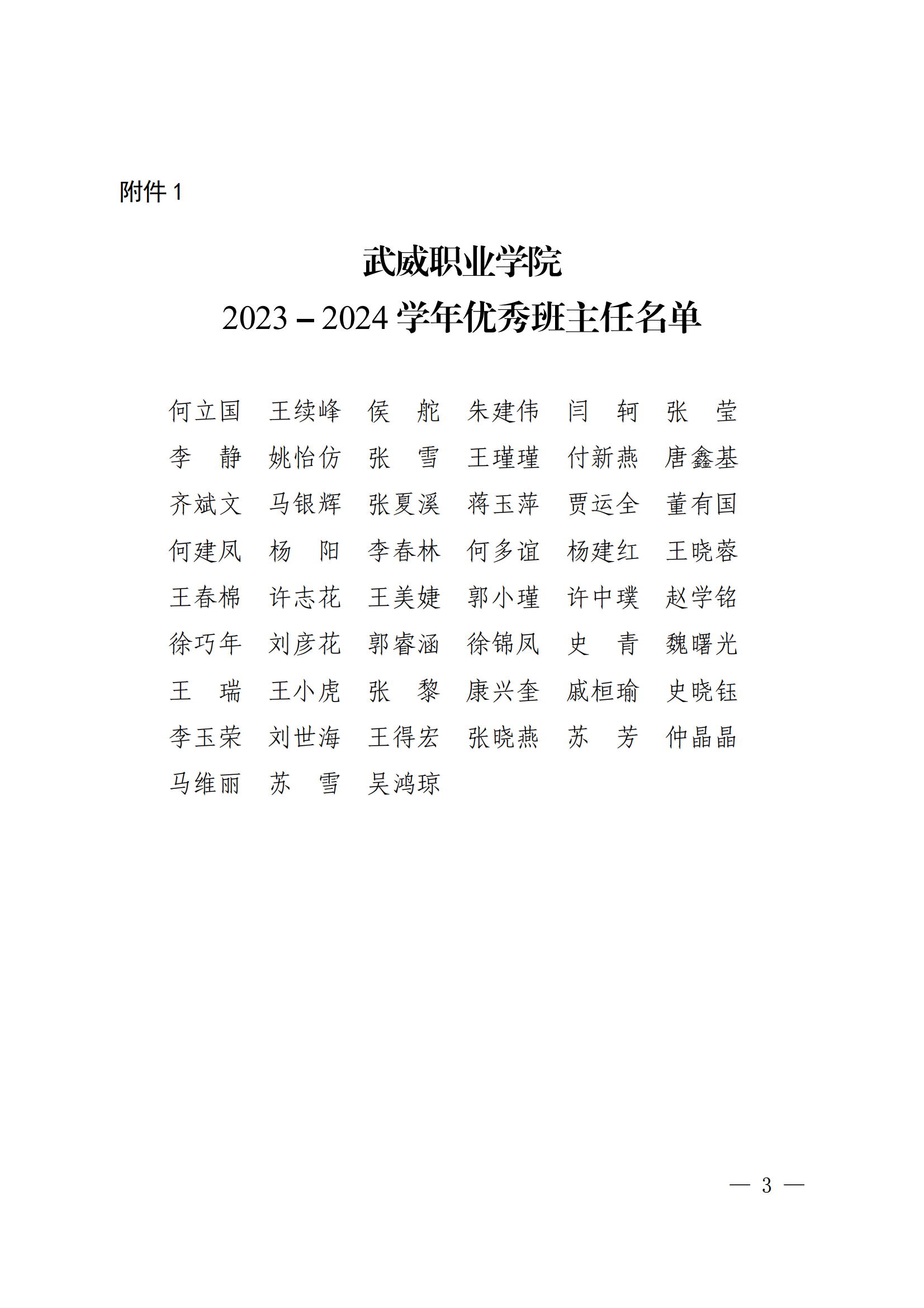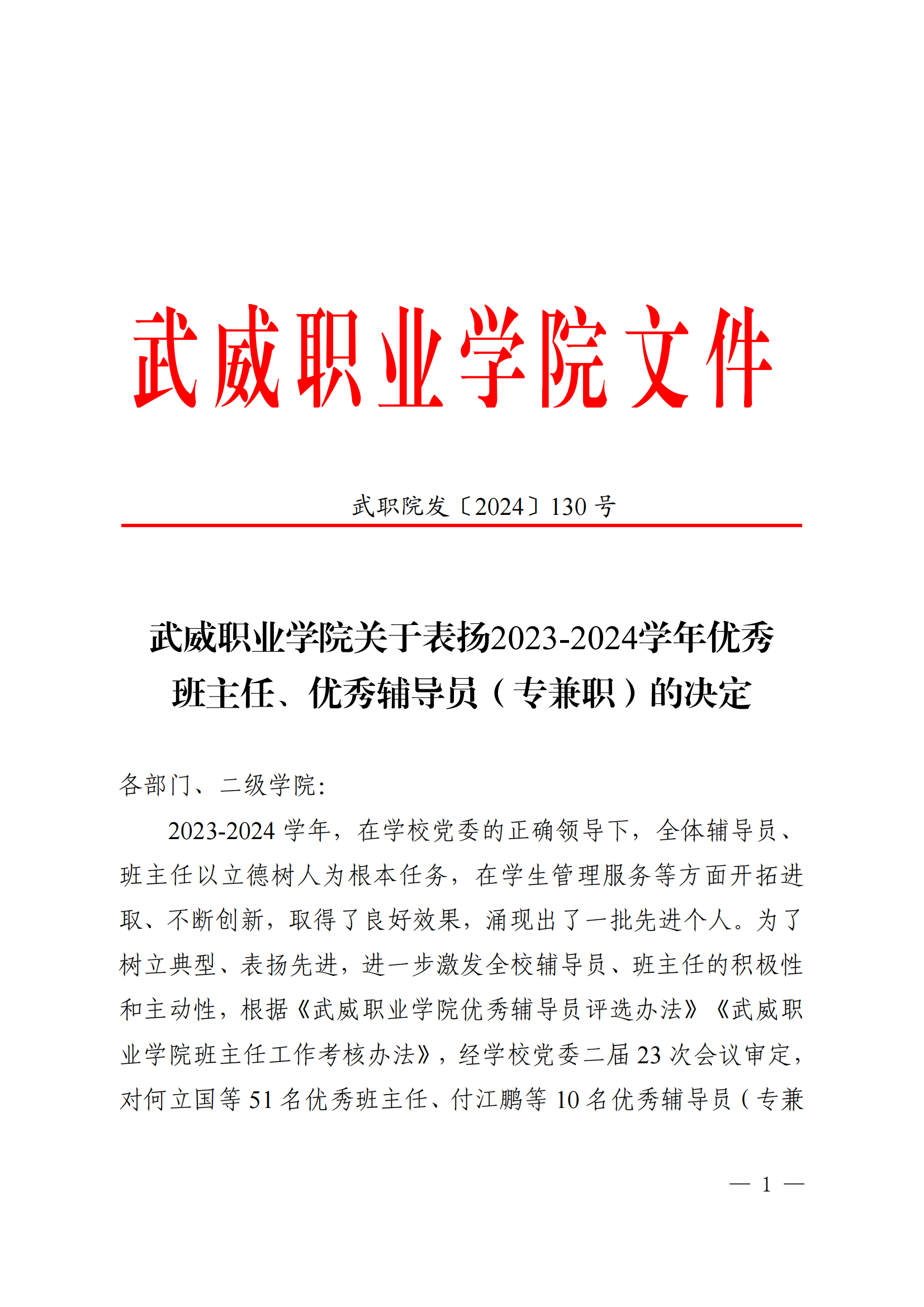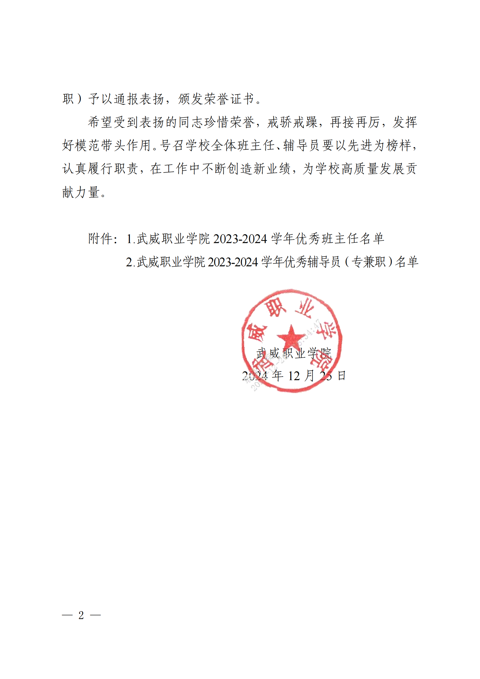 武威職業(yè)學院關(guān)于表揚2023-2024學年優(yōu)秀班主任、優(yōu)秀輔導員(專兼職)的決定