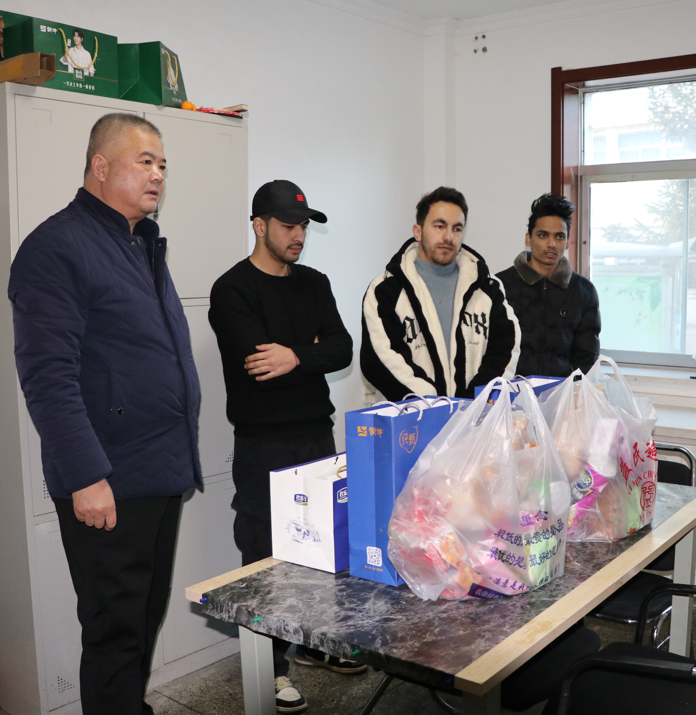 為深入了解來(lái)華留學(xué)生的學(xué)習(xí)和生活狀況,全面做好留學(xué)生的假期安全教育和服務(wù)保障工作,12月30日下午,在2025年新年來(lái)臨之際,黨委委員、副校長(zhǎng)王守云、學(xué)生工作部部長(zhǎng)張世亮、副部長(zhǎng)王鵬、保衛(wèi)處副處長(zhǎng)康興奎以及國(guó)際合作交流處全體工作人員走進(jìn)留學(xué)生公寓,給留學(xué)生們送去學(xué)校的關(guān)懷和新年的祝福。