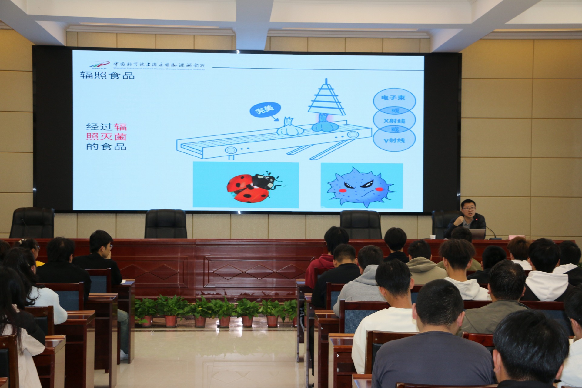 李吉豪做了題為《身入“輻”境,洞悉其益——輻照技術,點亮生活之光》的報告,從輻射技術概述科普、輻照技術在農(nóng)業(yè)領域的應用、輻照技術在高分子化工領域的應用等三個方面對輻照技術的前沿應用進行了生動的講解,現(xiàn)場師生大受裨益,也讓學生對自己所學相關專業(yè)有了更加深刻的理解,同時激發(fā)了同學們對專業(yè)知識的學習熱情。