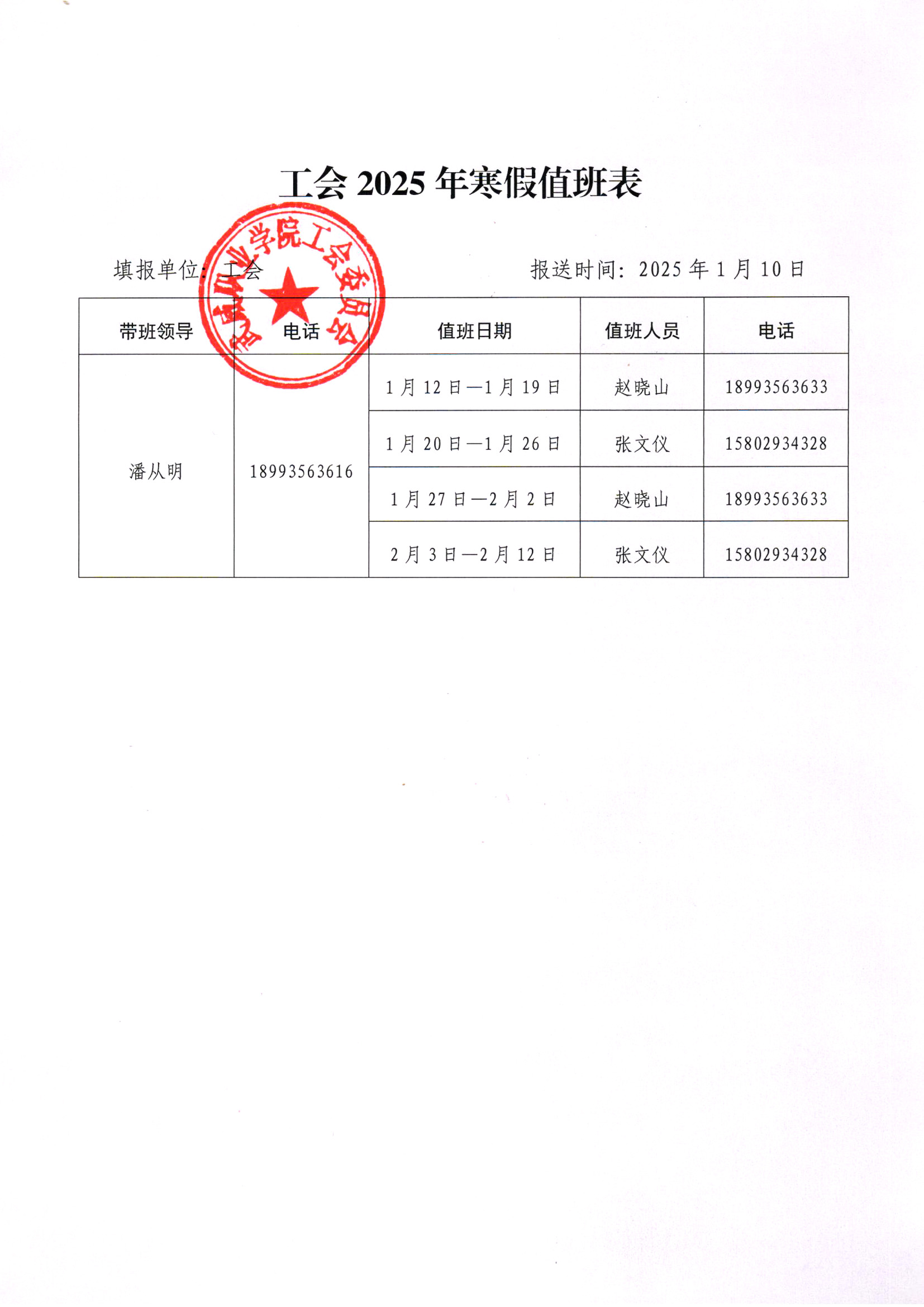 工會(huì)2025年寒假值班安排表