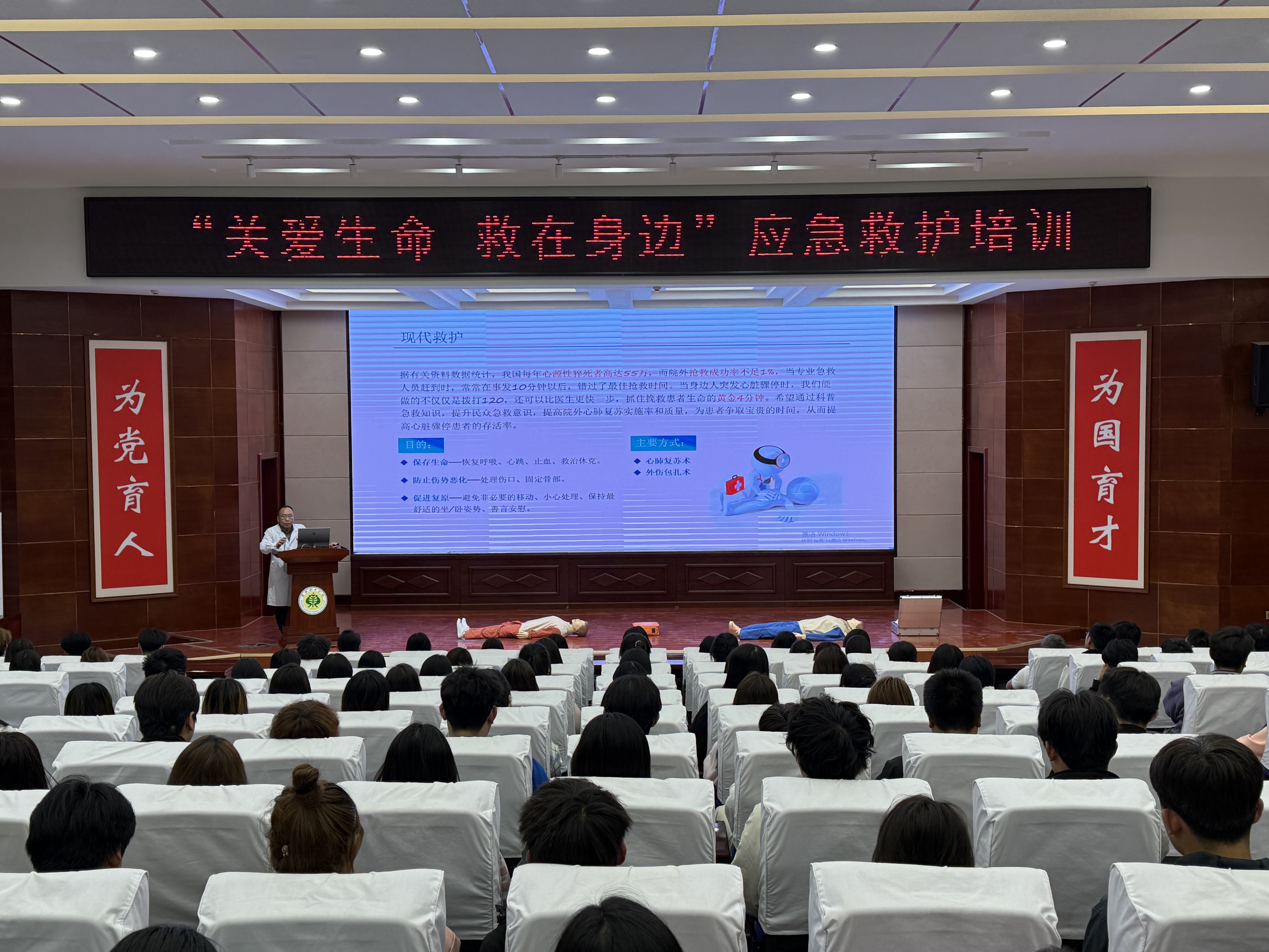 在理論環(huán)節(jié),武威市人民醫(yī)院急診科劉主任圍繞現(xiàn)代救護理念展開講解,重點強調“黃金4分鐘”在心肺復蘇中的關鍵作用,并詳細解讀心肺復蘇(CPR)操作流程、AED使用規(guī)范、海姆立克急救法及創(chuàng)傷救護技術。結合真實案例,劉主任糾正了“掐人中急救”“盲目搬動傷者”等常見誤區(qū),通過視頻演示和互動問答,幫助同學們掌握科學施救要點。“急救是每個公民的社會責任,關鍵時刻能挽救生命?!眲⒅魅蔚闹v解深入淺出,現(xiàn)場學生認真記錄,積極提問。?