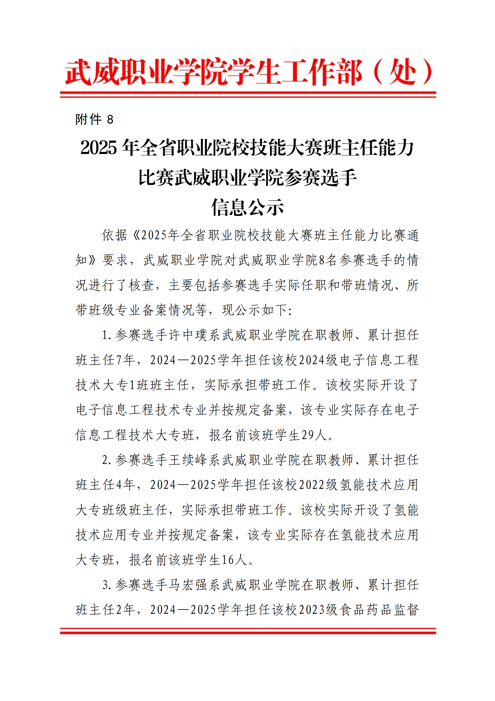 2025年全省職業(yè)院校技能大賽班主任能力比賽武威職業(yè)學院參賽選手信息公示