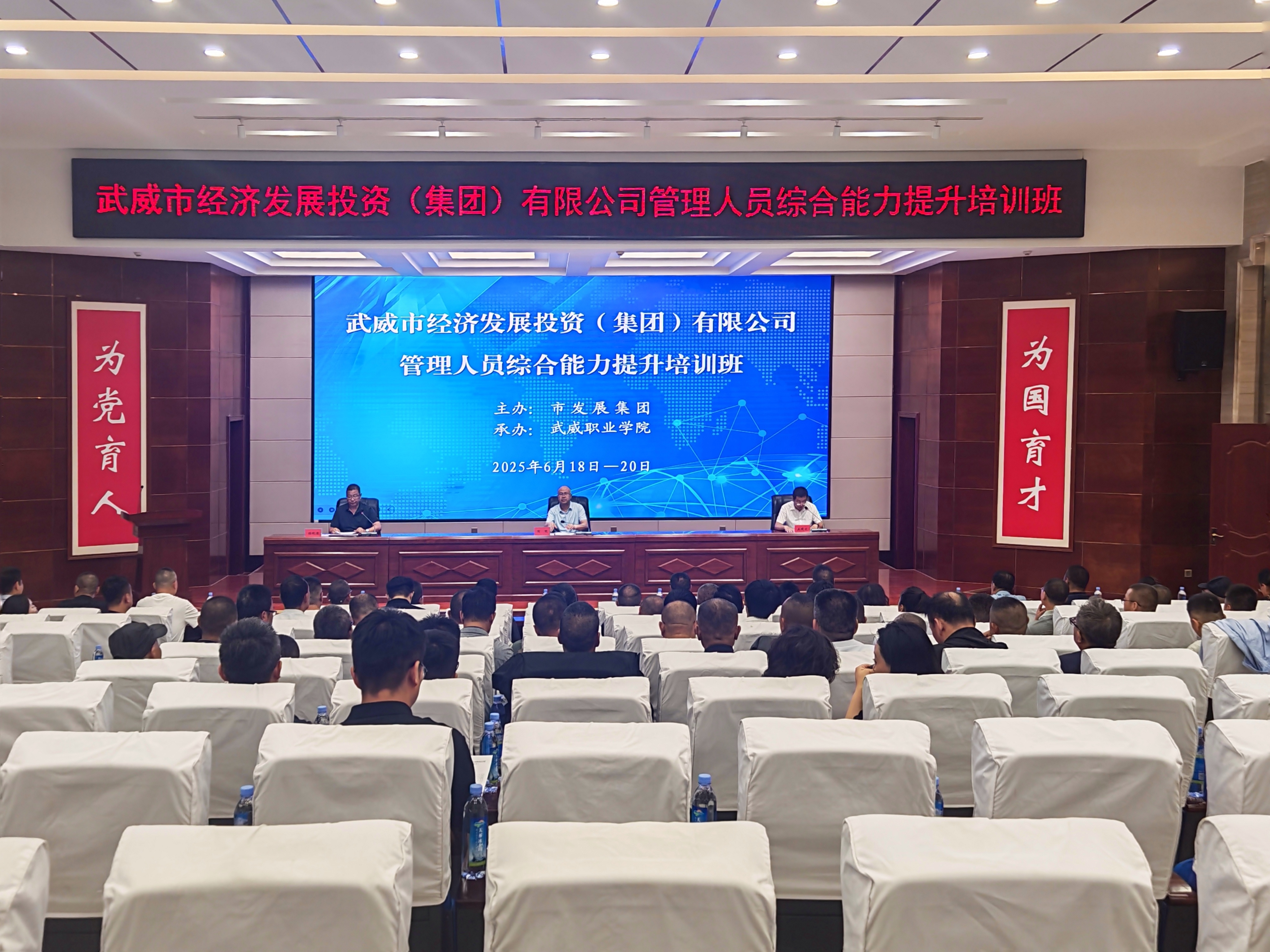 6月18日,由武威市經(jīng)濟發(fā)展投資(集團)有限公司主辦、學(xué)校承辦的武威市經(jīng)濟發(fā)展投資(集團)有限公司管理人員綜合能力提升培訓(xùn)班在菁英廳順利開班。市發(fā)展集團黨委副書記、總經(jīng)理陶明,學(xué)校黨委委員、紀(jì)委書記、監(jiān)察專員陳曉煜出席開班式,來自市發(fā)展集團機關(guān)、各子公司中層及以上管理人員共150人參加了開班式。