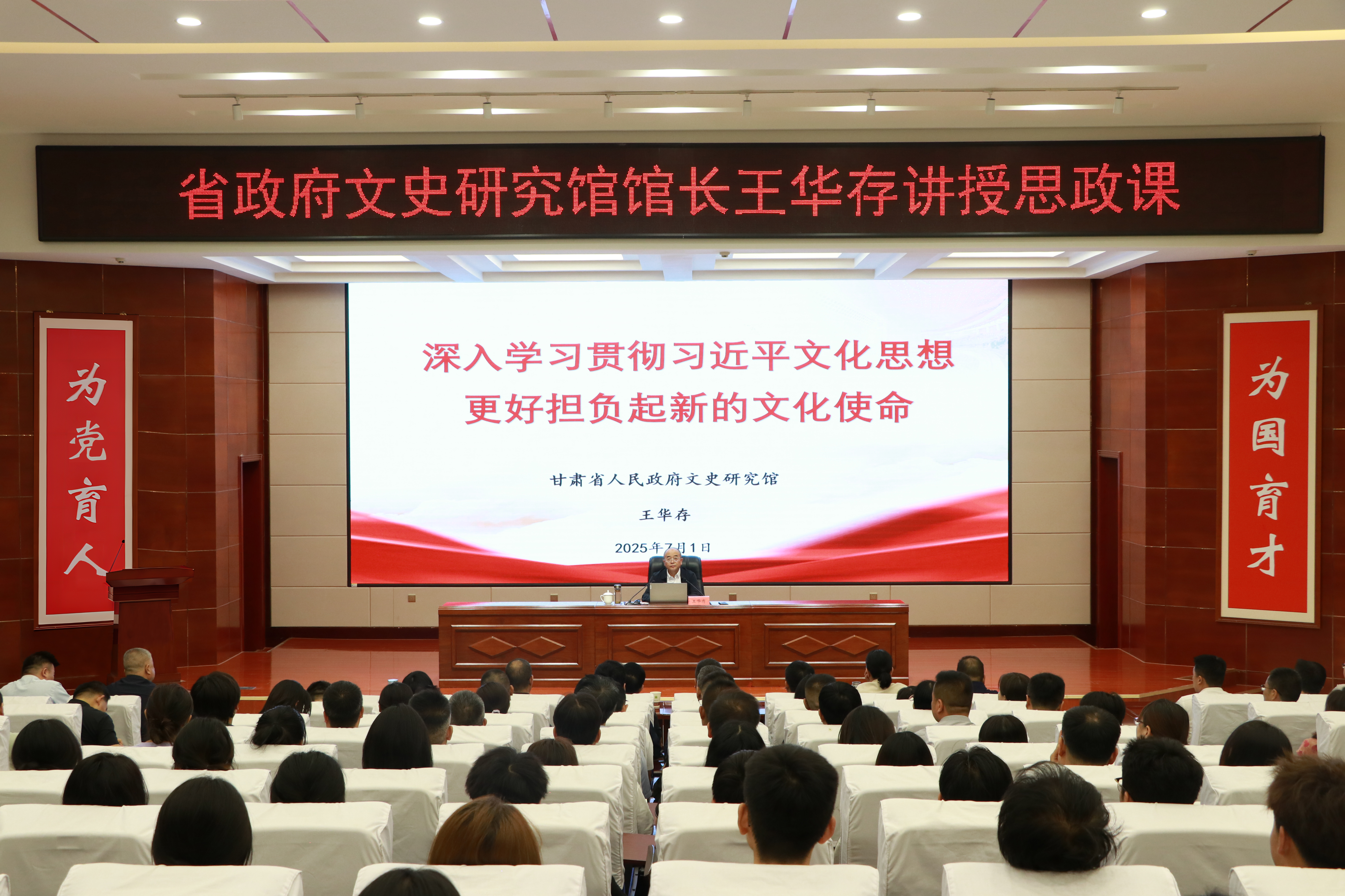 7月1日,在全校上下喜迎中國共產(chǎn)黨成立104周年之際,甘肅省人民政府文史研究館黨組書記、館長王華存到學(xué)校為師生講授思想政治理論課。王華存以“深入學(xué)習(xí)貫徹習(xí)近平文化思想 更好擔(dān)負(fù)起新的文化使命”為題,從深刻認(rèn)識習(xí)近平文化思想的形成過程、習(xí)近平文化思想的豐富內(nèi)涵和核心要義、甘肅文化歷史簡述、當(dāng)代青年如何更好擔(dān)當(dāng)起新的文化使命四個方面對習(xí)近平文化思想進(jìn)行了全面解讀。黨委書記王宏主持,學(xué)校領(lǐng)導(dǎo)、中層管理干部及師生代表共200余人到場聆聽。