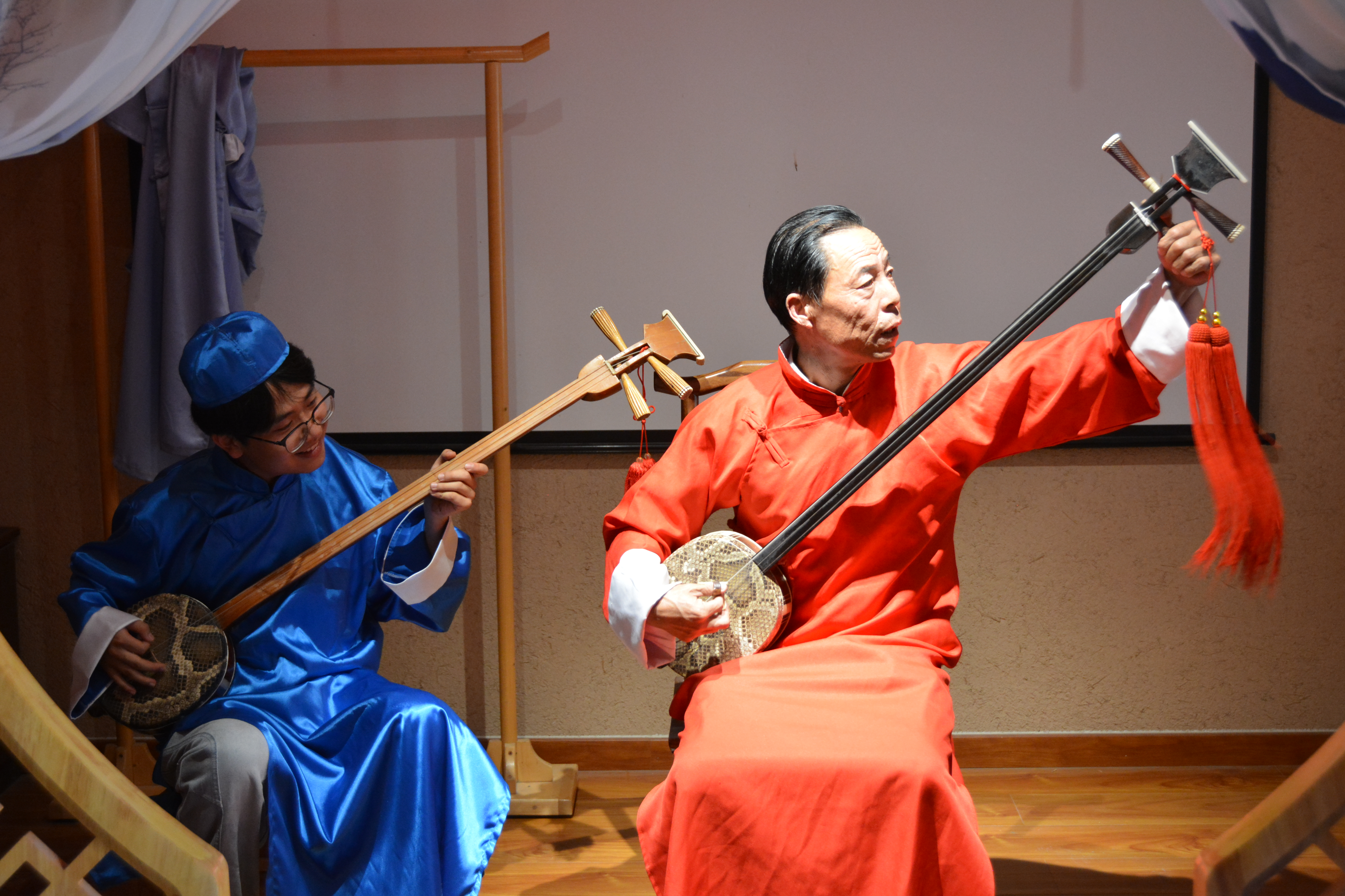 非遺民俗文化館當(dāng)天化身成為一座流動(dòng)的非遺課堂,實(shí)踐團(tuán)成員們圍坐在古樸的庭院中,聚精會(huì)神地聆聽當(dāng)?shù)刭Y深賢孝藝人董永虎老師深情演繹的經(jīng)典曲目。老藝人蒼勁而富有穿透力的嗓音,伴著三弦琴弦的顫動(dòng),將一段段蘊(yùn)含忠孝節(jié)義、勸人向善的古老故事娓娓道來(lái)。那飽經(jīng)歲月洗禮的曲調(diào),仿佛穿越時(shí)空,在青磚黛瓦間回蕩,讓在場(chǎng)的每一位學(xué)子都深深沉浸其中,體味著這門古老說(shuō)唱藝術(shù)所承載的歷史重量與人文溫度。