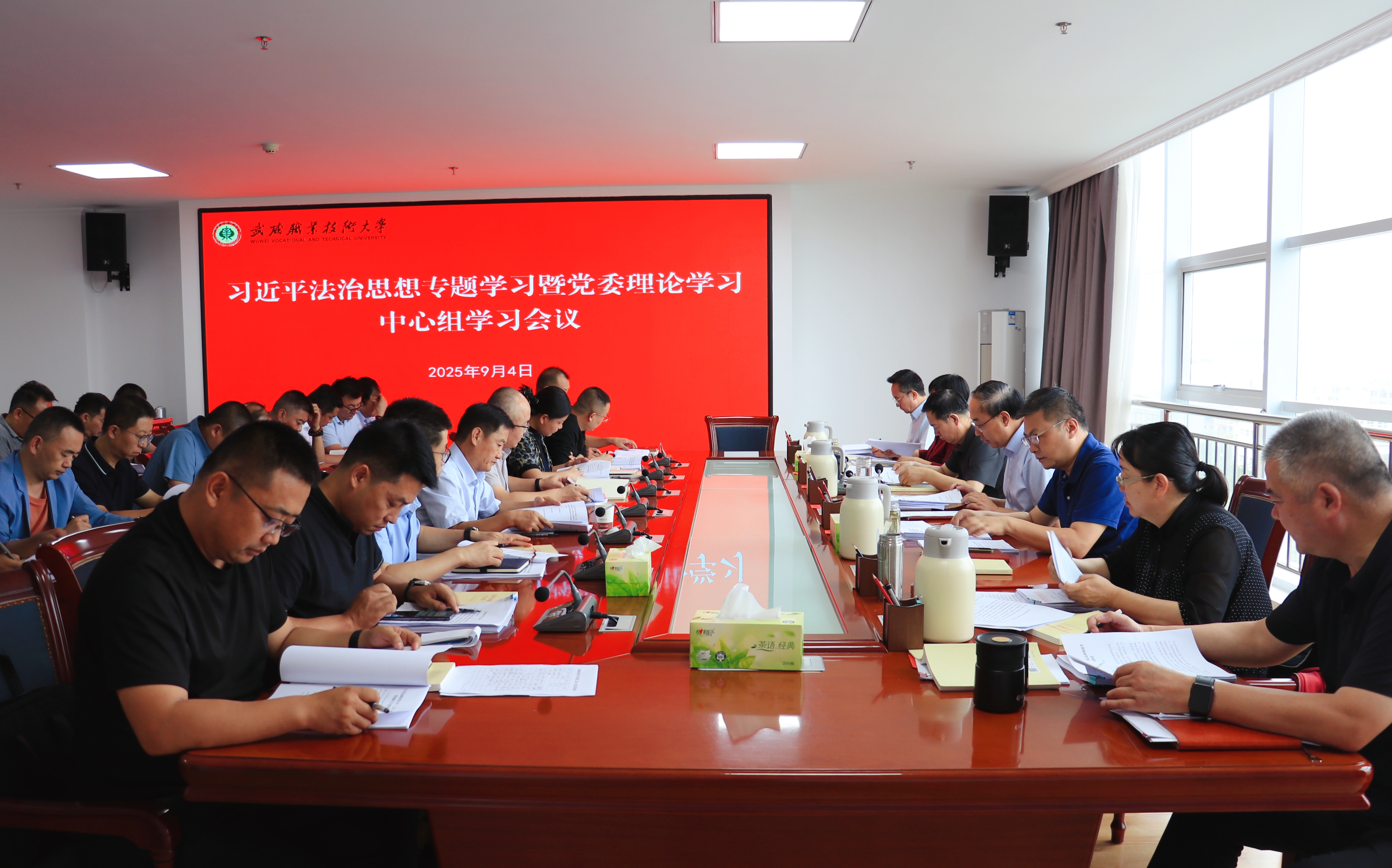 會議傳達(dá)學(xué)習(xí)習(xí)近平總書記在紀(jì)念中國人民抗日戰(zhàn)爭暨世界反法西斯戰(zhàn)爭勝利80周年大會上的重要講話、習(xí)近平總書記在2025年第17期《求是》雜志發(fā)表的重要文章《弘揚(yáng)偉大抗戰(zhàn)精神,向著中華民族偉大復(fù)興的光輝彼岸奮勇前進(jìn)》;專題學(xué)習(xí)習(xí)近平法治思想,主要傳達(dá)學(xué)習(xí)《習(xí)近平論全面依法治國》《習(xí)近平法治思想學(xué)習(xí)綱要》《習(xí)近平法治思想學(xué)習(xí)問答》等內(nèi)容;傳達(dá)學(xué)習(xí)法律法規(guī)和教育法規(guī)等相關(guān)內(nèi)容;校黨委理論學(xué)習(xí)中心組成員圍繞習(xí)近平法治思想,緊密結(jié)合思想和工作實(shí)際,深入開展了交流研討。