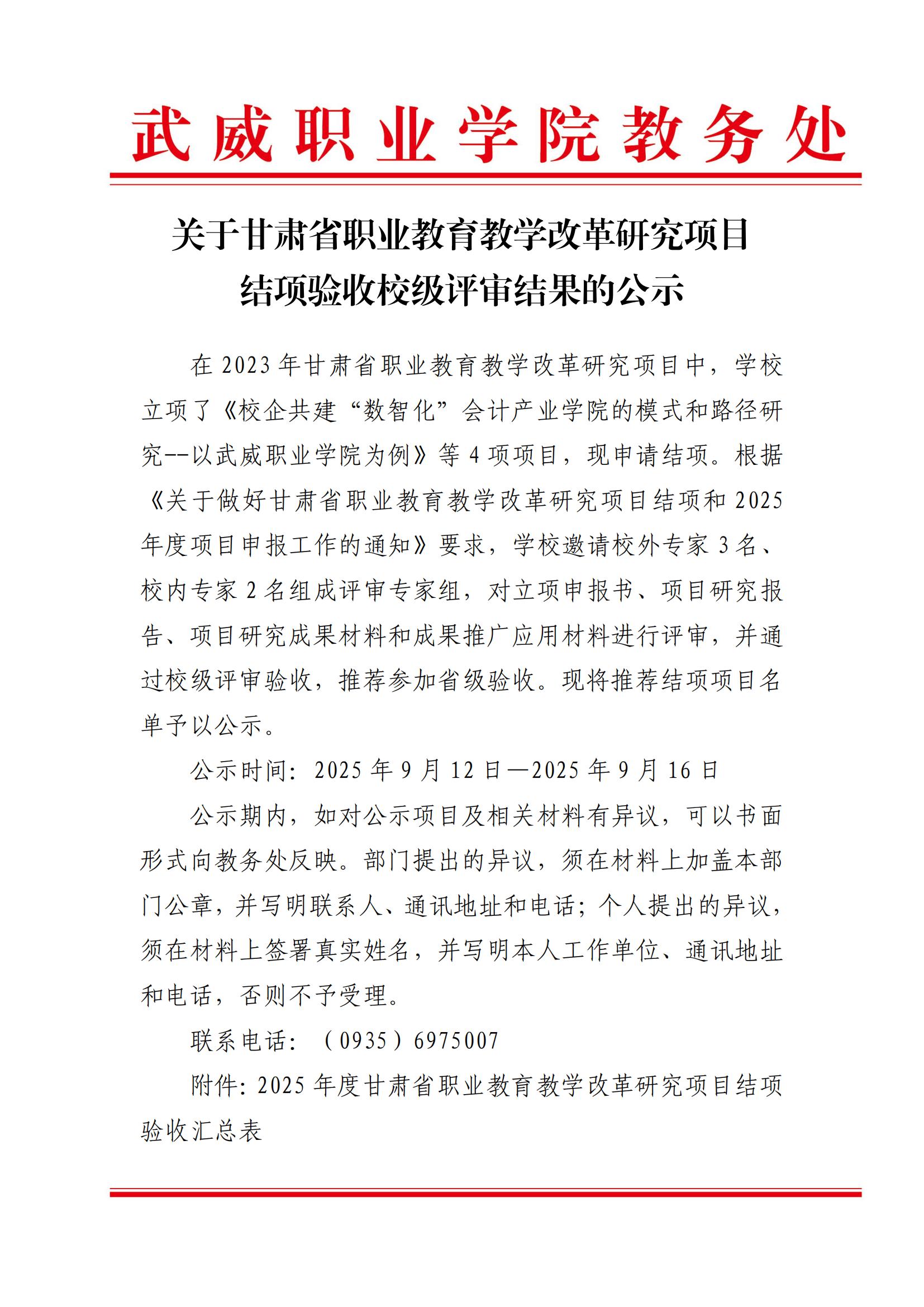 關于甘肅省職業(yè)教育教學改革研究項目結(jié)項驗收校級評審結(jié)果的公示