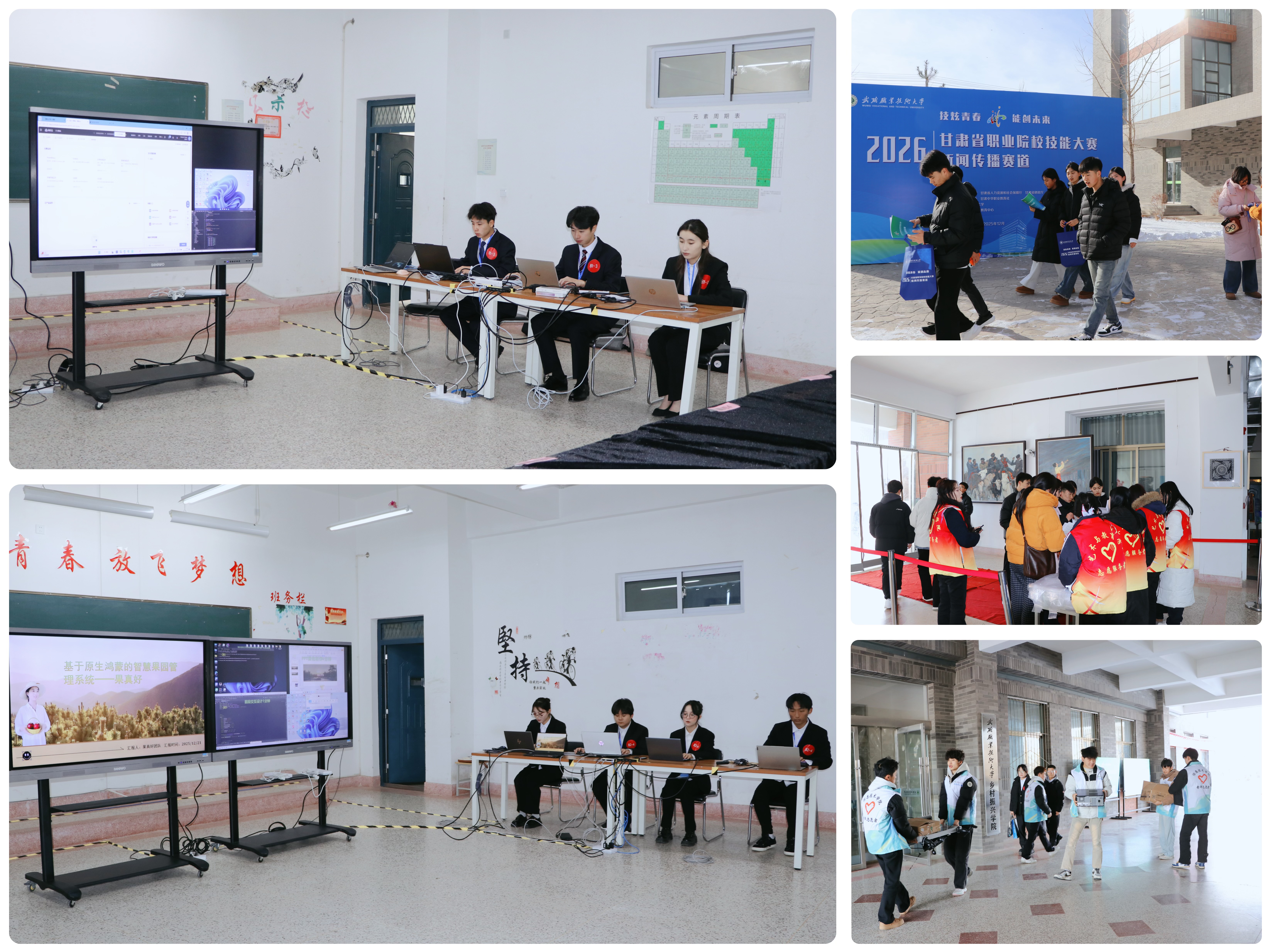 12月21日,學(xué)校黨委書(shū)記王宏帶隊(duì)深入學(xué)校承辦的甘肅省2026年職業(yè)院校技能大賽比賽現(xiàn)場(chǎng),實(shí)地巡查高職組新聞傳播賽道、新一代信息技術(shù)賽道的比賽情況。賽點(diǎn)監(jiān)督仲裁組組長(zhǎng)汪霞、成員王立榮、陳曉煜,學(xué)校教務(wù)處負(fù)責(zé)同志一同巡查。