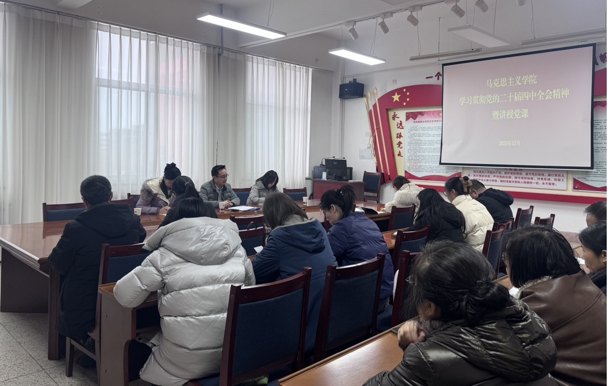 為推動(dòng)黨的二十屆四中全會(huì)精神在學(xué)院落地生根,進(jìn)一步統(tǒng)一思想、凝聚共識(shí)、激發(fā)干勁,12月31日,馬克思主義學(xué)院開(kāi)展深入學(xué)習(xí)貫徹黨的二十屆四中全會(huì)精神專題學(xué)習(xí)活動(dòng),學(xué)院黨總支書(shū)記任陶在勵(lì)勤樓209會(huì)議室講授專題黨課,全體教師參加。