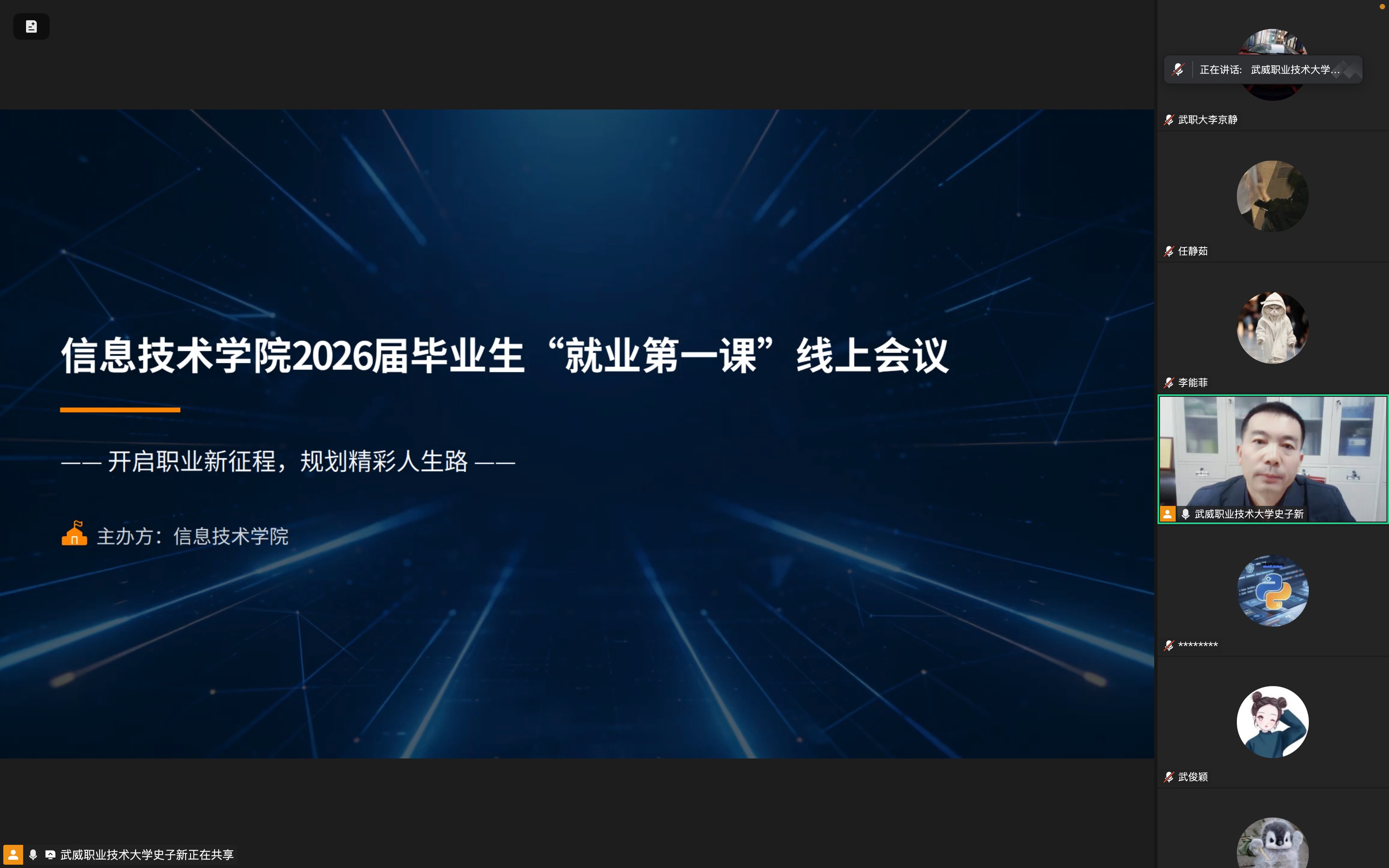 為深入貫徹落實(shí)高校“寒假促就業(yè)暖心行動”工作要求,切實(shí)做好2026屆畢業(yè)生就業(yè)指導(dǎo)服務(wù),幫助實(shí)習(xí)階段的畢業(yè)生明晰職業(yè)方向、提升求職競爭力,3月5日,信息技術(shù)學(xué)院黨總支書記史子新通過“線下會場+線上同步直播”的形式,為全體2026屆畢業(yè)生及畢業(yè)班班主任開展了題為“開啟職業(yè)新征程,規(guī)劃精彩人生路”的“就業(yè)第一課”專題講座。