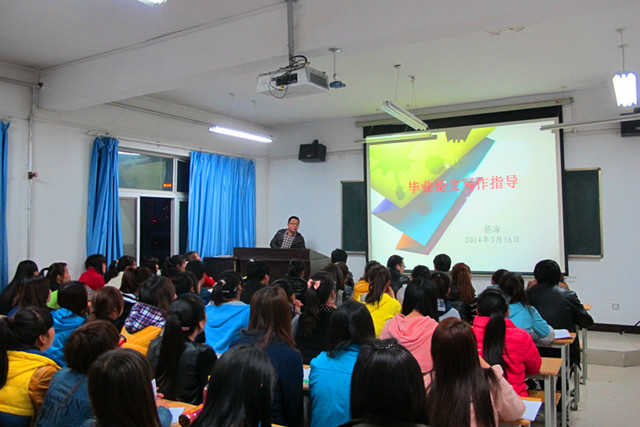 系主任晏素珍對本次畢業(yè)生畢業(yè)論文(設計)做了三點要求,一是全體畢業(yè)生要高度重視畢業(yè)論文(設計)的寫作;二是嚴格按照指導教師的要求保質(zhì)保量的完成論文;三是每位指導老師對論文指導工作要認真負責、耐心細致。蔡海老師做了題為《畢業(yè)生論文寫作指導》的報告,主要從論文格式要求、文獻查詢方法、論文寫作方法三個方面給同學們做了深入淺出的講解,受到同學們的熱烈歡迎。