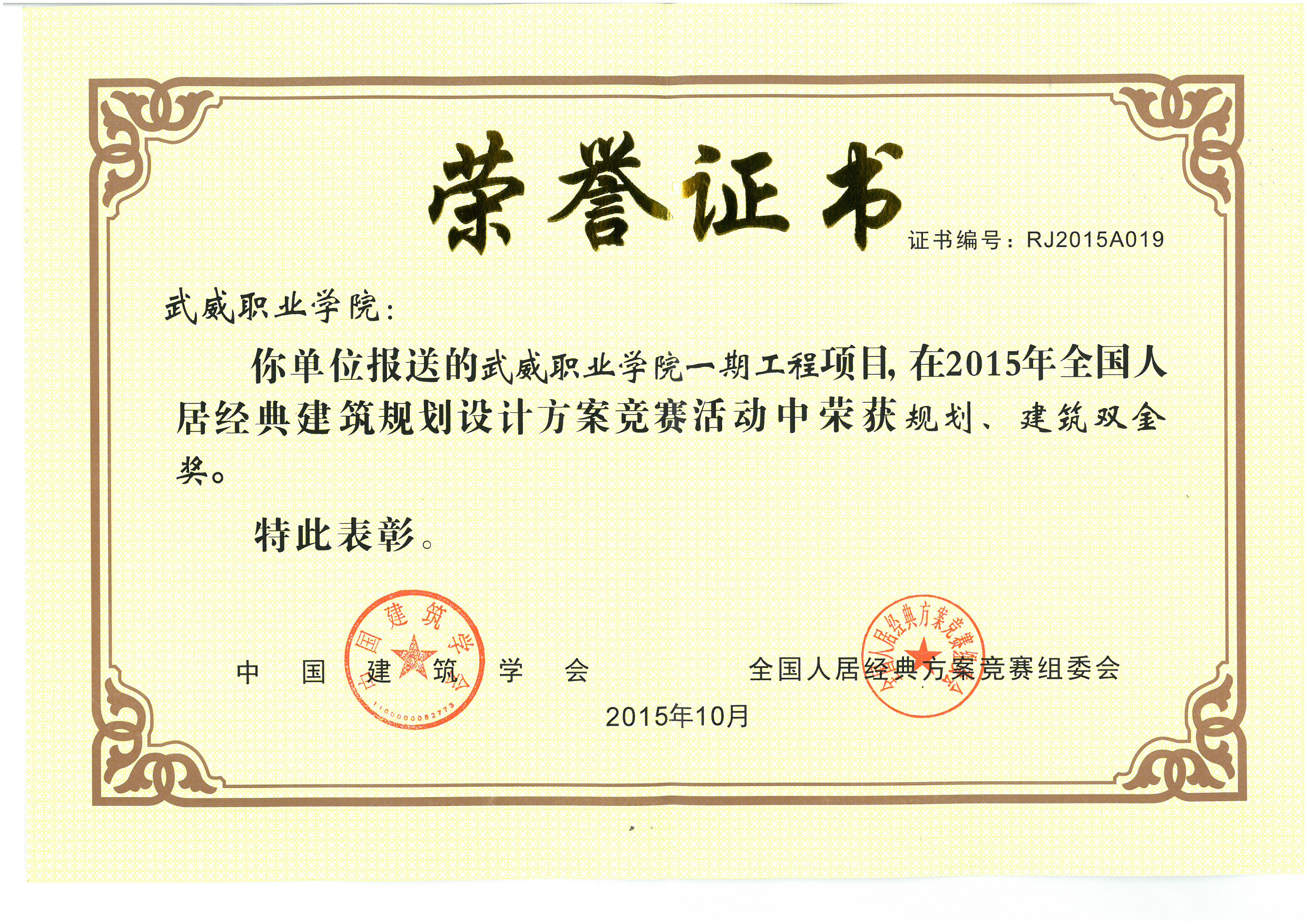 2015年10月,第十五屆全國人居經(jīng)典建筑規(guī)劃設(shè)計(jì)方案競(jìng)賽結(jié)果在北京揭曉,我院報(bào)送的武威職業(yè)學(xué)院一期擴(kuò)建項(xiàng)目在全國眾多參賽項(xiàng)目中脫穎而出,榮膺規(guī)劃、建筑雙金獎(jiǎng)。全國人居經(jīng)典方案競(jìng)賽由中國建筑學(xué)會(huì)主辦,全國人居經(jīng)典方案競(jìng)賽組委會(huì)承辦,自2001年起每年舉辦一屆,參賽項(xiàng)目覆蓋全國所有省份及港澳臺(tái)地區(qū),評(píng)審專家皆為業(yè)界權(quán)威,獲獎(jiǎng)難度大,權(quán)威性高。榮膺規(guī)劃、建筑雙金獎(jiǎng)是武威建筑項(xiàng)目上的首次。