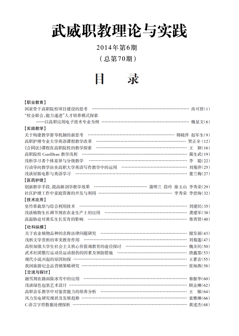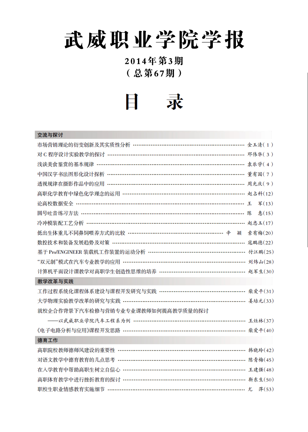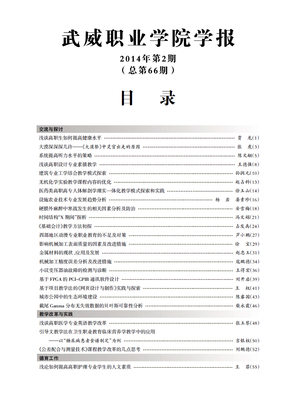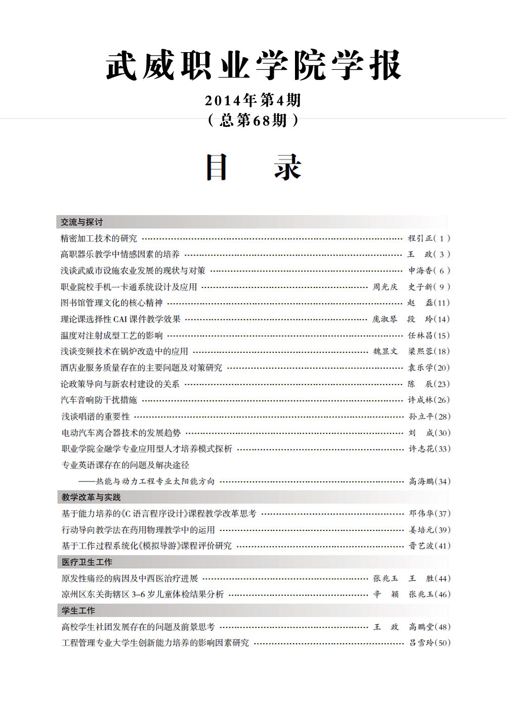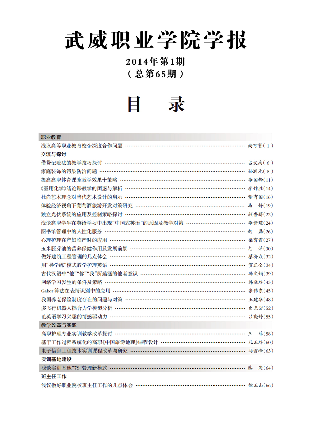 2014年《武威職業(yè)學(xué)院學(xué)報(bào)》目錄