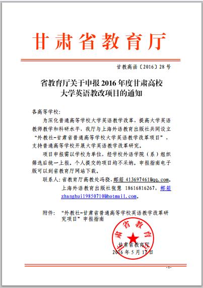 省教育廳關(guān)于申報2016年度甘肅高校大學(xué)英語教改項目的通知