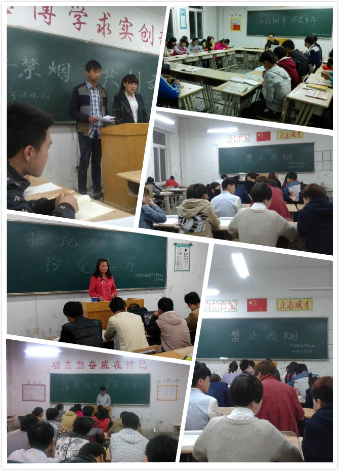 在班會中,各班主任向同學(xué)們宣讀了學(xué)院《關(guān)于在校園內(nèi)公共場所戒煙的通知》和《校園禁煙倡議書》,并提出作為一名學(xué)生,除了要有遠大的理想、高尚的情操、淵博的知識、嚴謹?shù)募o律作風(fēng)外,還要有一個健康的身體。為了我們的健康,我們呼吁,同學(xué)們應(yīng)自覺的遠離香煙,并勸說吸煙的親友盡快戒煙。讓我們每一位同學(xué)做出承諾,自覺拒絕煙草,遠離煙草危害。堅決不吸煙,拒吸第一支煙,勸告他人不吸煙,不做吸煙的新一代。人人爭做文明、健康、遵紀守法的好學(xué)生,使每一位師生都擁有一個健康的生活環(huán)境。