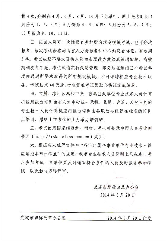 <轉(zhuǎn)>武威市職稱改革辦公室關(guān)于2014年度全市專業(yè)技術(shù)人員職稱計(jì)算機(jī)應(yīng)用能力考試、培訓(xùn)工作有關(guān)事宜的通知