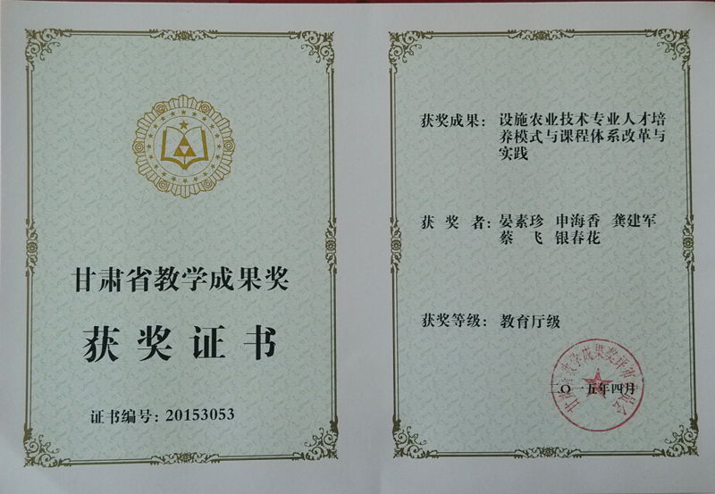 2015年甘肅省教學(xué)成果獎:設(shè)施農(nóng)業(yè)技術(shù)專業(yè)人才培養(yǎng)模式與課程體系改革與實踐