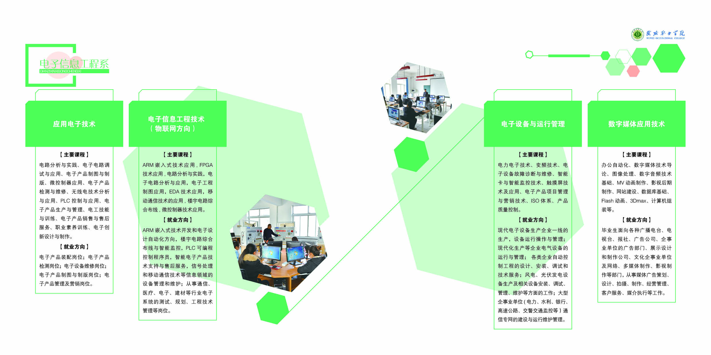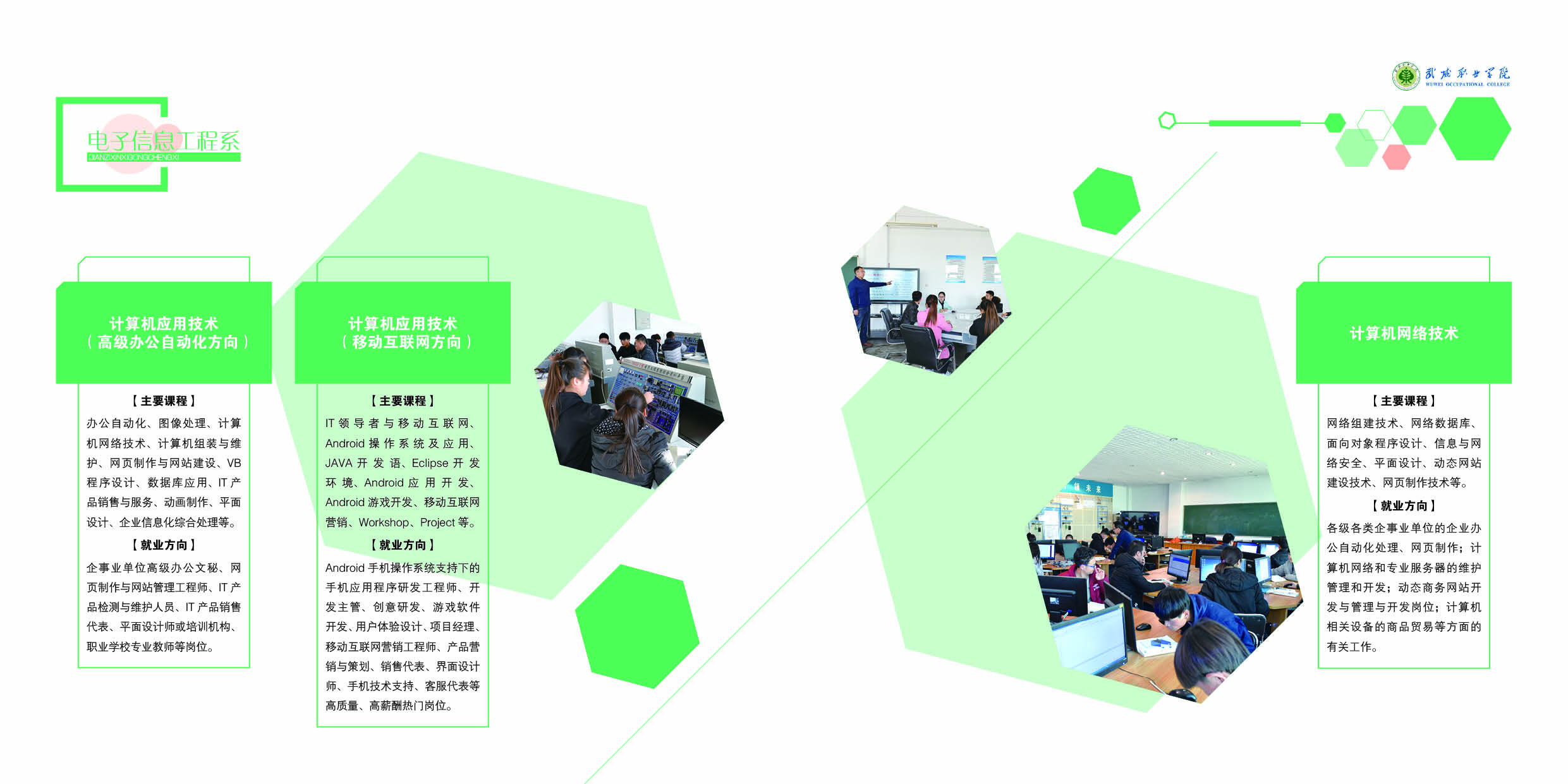主要課程:辦公自動(dòng)化、圖像處理、計(jì)算機(jī)網(wǎng)絡(luò)技術(shù)、計(jì)算機(jī)組裝與維護(hù)、網(wǎng)頁制作與網(wǎng)站建設(shè)、VB程序設(shè)計(jì)、數(shù)據(jù)庫應(yīng)用、IT產(chǎn)品銷售與服務(wù)、動(dòng)畫制作、平面設(shè)計(jì)、企業(yè)信息化綜合處理等。