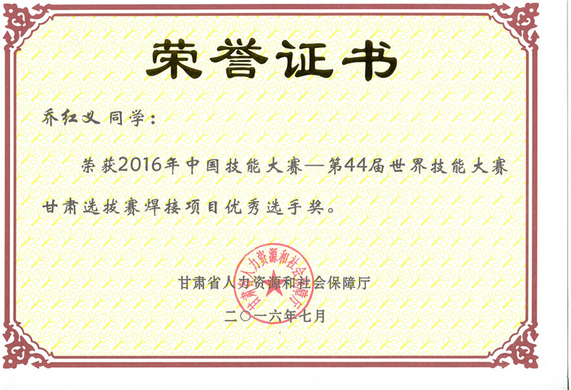 第44屆世界技能大賽甘肅選拔賽焊接項(xiàng)目?jī)?yōu)秀獎(jiǎng)
