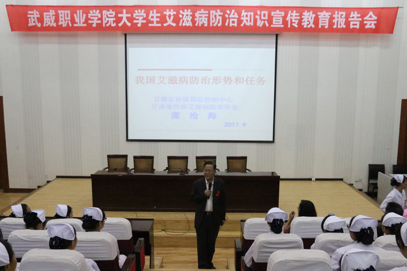 9月21日晚,甘肅省性病艾滋病防治協(xié)會(huì)副會(huì)長(zhǎng)、甘肅省艾滋病首席專家、主任醫(yī)師席倉(cāng)海教授在學(xué)院正德廳為我院學(xué)生作了一場(chǎng)“大學(xué)生艾滋病防治知識(shí)宣傳教育”講座,講座由市疾控中心主任楊天琳主持,學(xué)院護(hù)理系黨總支書記張建輝、市疾控中心性病艾滋病科科長(zhǎng)王永瑚、市中心血站血源科科長(zhǎng)邢志勇及學(xué)院各級(jí)團(tuán)干部和紅絲帶協(xié)會(huì)共280多人聆聽了講座。