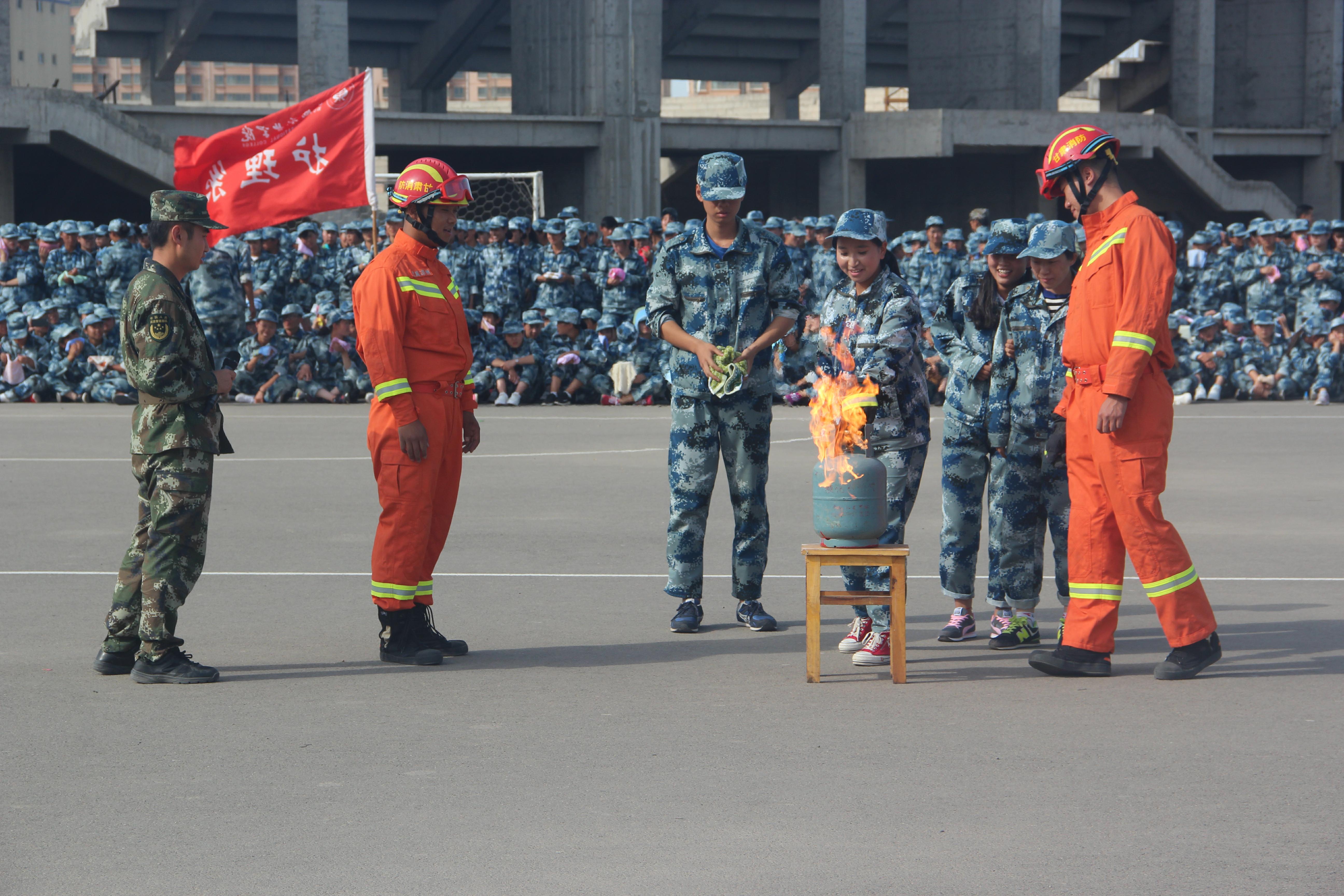 隨后,所有參演學生整隊到操場參加了滅火演練。在消防官兵的講解和和示范下,同學們體驗了處置著火液化氣瓶、干粉滅火器滅火,通過模型煙室等操作。
