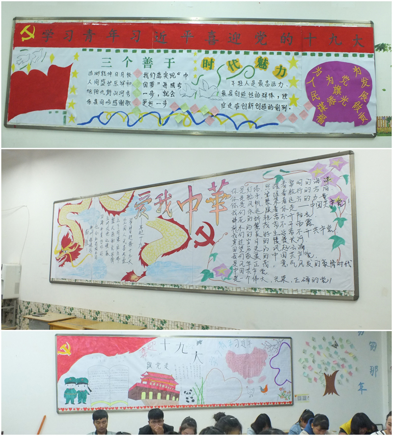 在黨的十九大即將召開之際,為進一步深化“中國夢”和“社會主義核心價值觀”主題教育,增進我系學生的愛國熱情和團結(jié)意識,營造良好的校園文化氛圍,引導學生準確把握中國夢的本質(zhì)屬性,將個人夢想融入中國夢中,自覺增強奮斗拼搏精神,積極踐行社會主義核心價值觀,10月10日,經(jīng)我系黨總支研究決定,由系團總支負責,各班團支部開展“學習青年習近平,喜迎黨的十九大”為主題的黑板報評比活動。