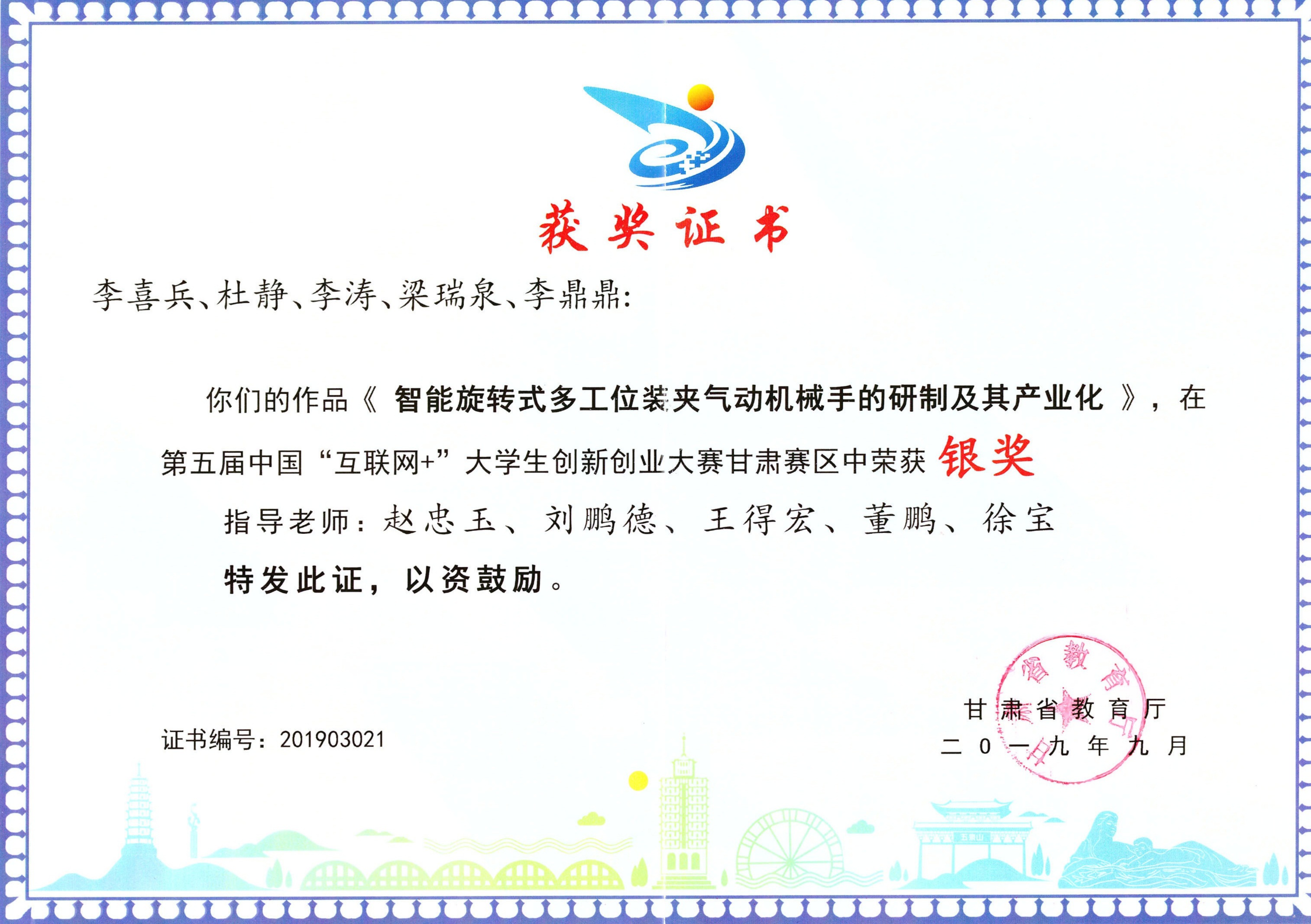 .第五屆中國(guó)“互聯(lián)網(wǎng)+”大學(xué)生創(chuàng)新創(chuàng)業(yè)大賽甘肅賽區(qū)《智能旋轉(zhuǎn)式多工位裝夾氣動(dòng)機(jī)械手的研制及其產(chǎn)業(yè)化》
