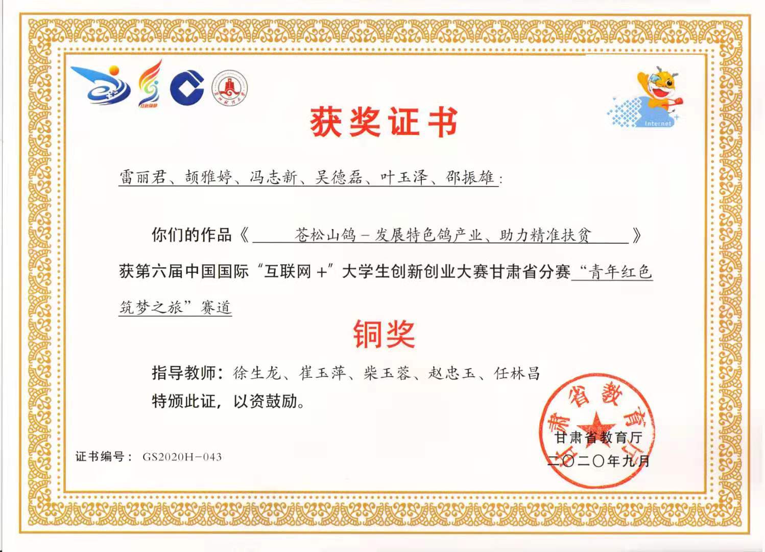 第六屆中國(guó)國(guó)際“互聯(lián)網(wǎng)+”大學(xué)生創(chuàng)新創(chuàng)業(yè)大賽甘肅省分賽“青年紅色筑夢(mèng)之旅”賽道《蒼松山鴿-發(fā)展特色鴿產(chǎn)業(yè)、助力精準(zhǔn)脫貧》