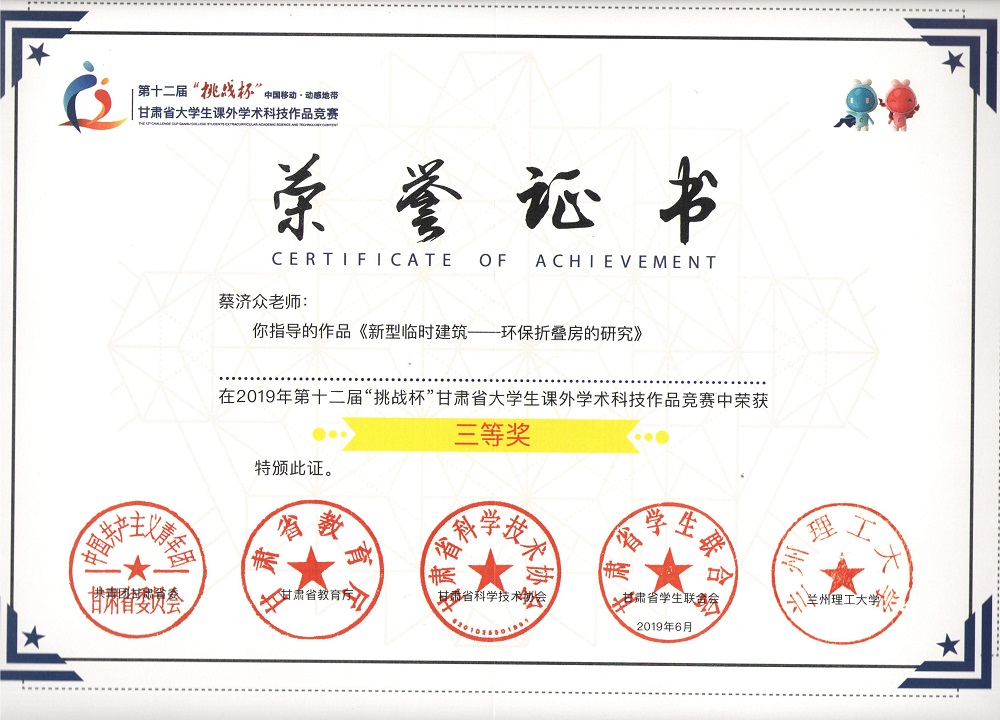 第十二屆“挑戰(zhàn)杯”甘肅省大學(xué)生課外學(xué)術(shù)科學(xué)作品《新型臨時(shí)建筑—環(huán)保折疊房的研究》