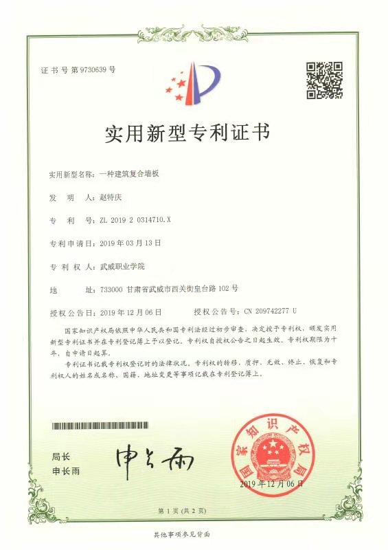 2019年12月項(xiàng)目組成員趙特慶獲得國家實(shí)用性專利授權(quán)1項(xiàng)