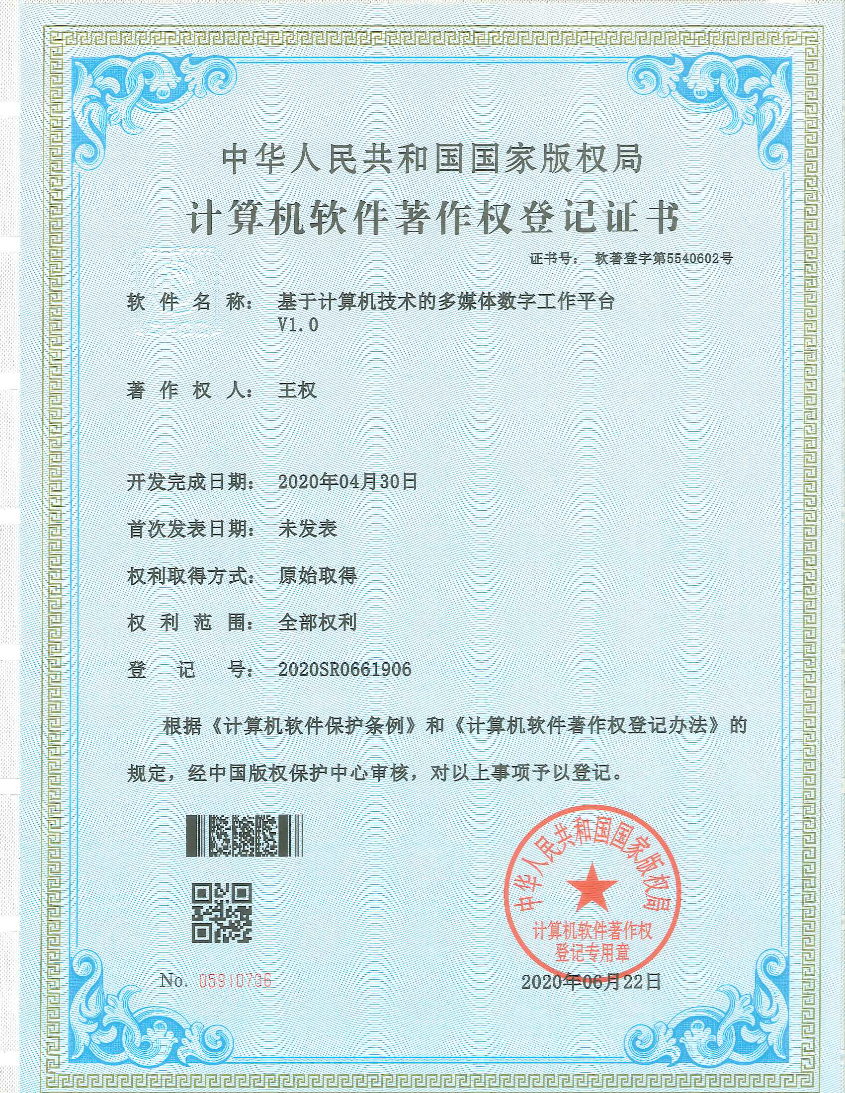 2020年6月項(xiàng)目組成員王權(quán)獲得《基于計(jì)算機(jī)技術(shù)的多媒體數(shù)字工作平臺(tái)V1.0》軟件著作權(quán)