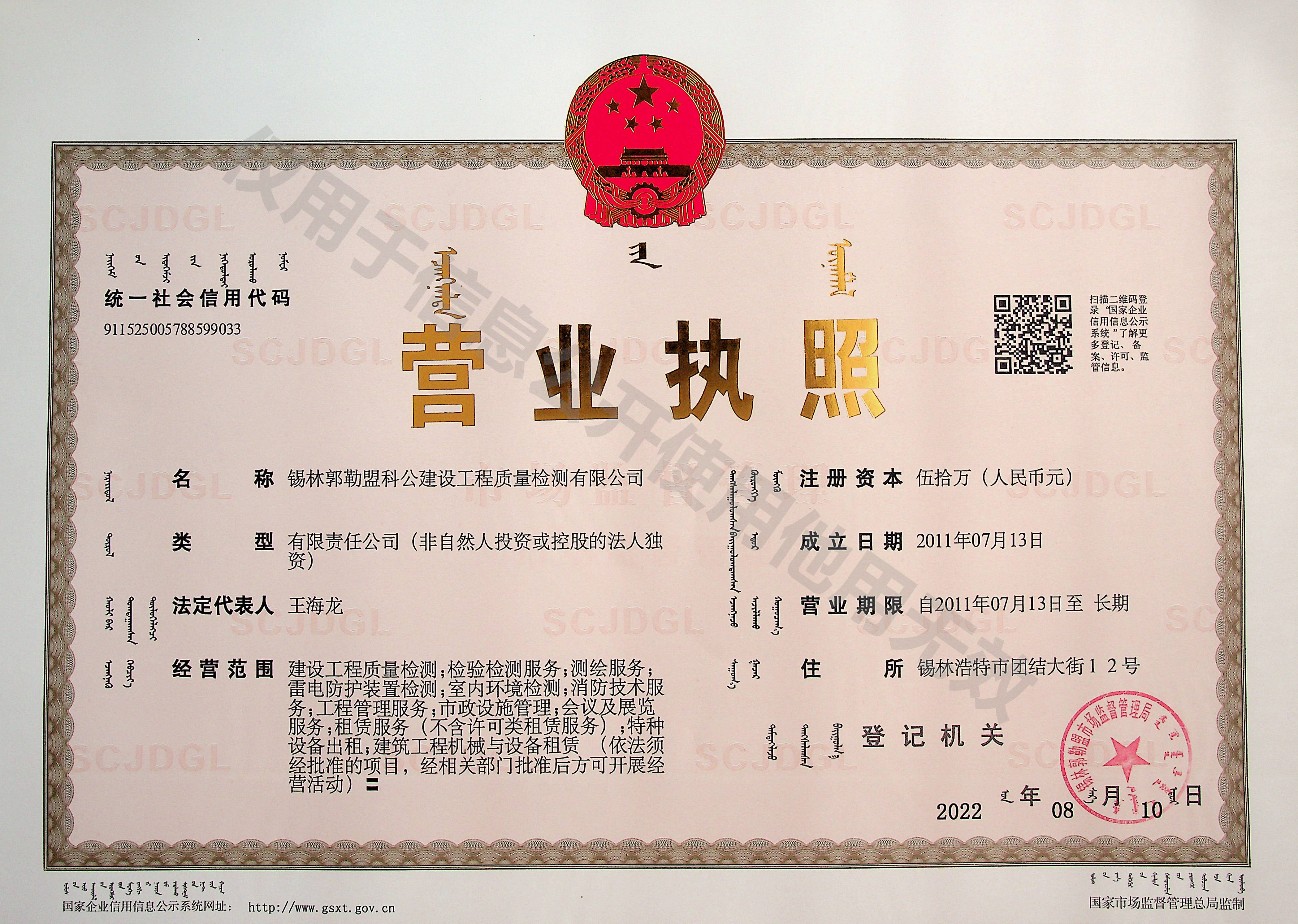 公司資質(zhì):內(nèi)蒙古自治區(qū)市場監(jiān)督管理局頒發(fā)的“CMA資質(zhì)認定證書”、內(nèi)蒙古住房和城鄉(xiāng)建設廳頒發(fā)的“建設工程質(zhì)量檢測機構(gòu)資質(zhì)證書”、中國建筑業(yè)協(xié)會頒發(fā)的“建設工程質(zhì)量檢測機構(gòu)AAA級信用等級證書”。